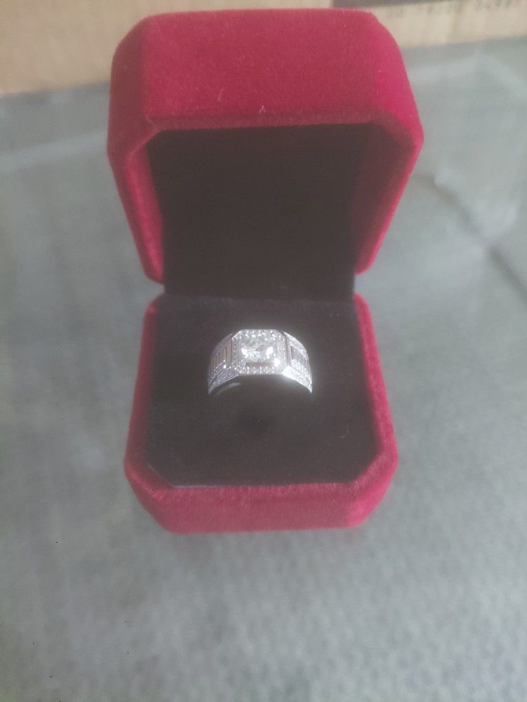 One stamped Sterling Silver combination cast & Assembled ring with a rhodium finish. Identified with marking of 925 . One prong set cut moisssanite measures 6.53-6.50x3.87mm. Approximate weight of 1.00ct. Eighty four shaered prong set cut cubic zirconiums measures 1.00-1.00x0.65mm Approximate total weight of 0.40ct