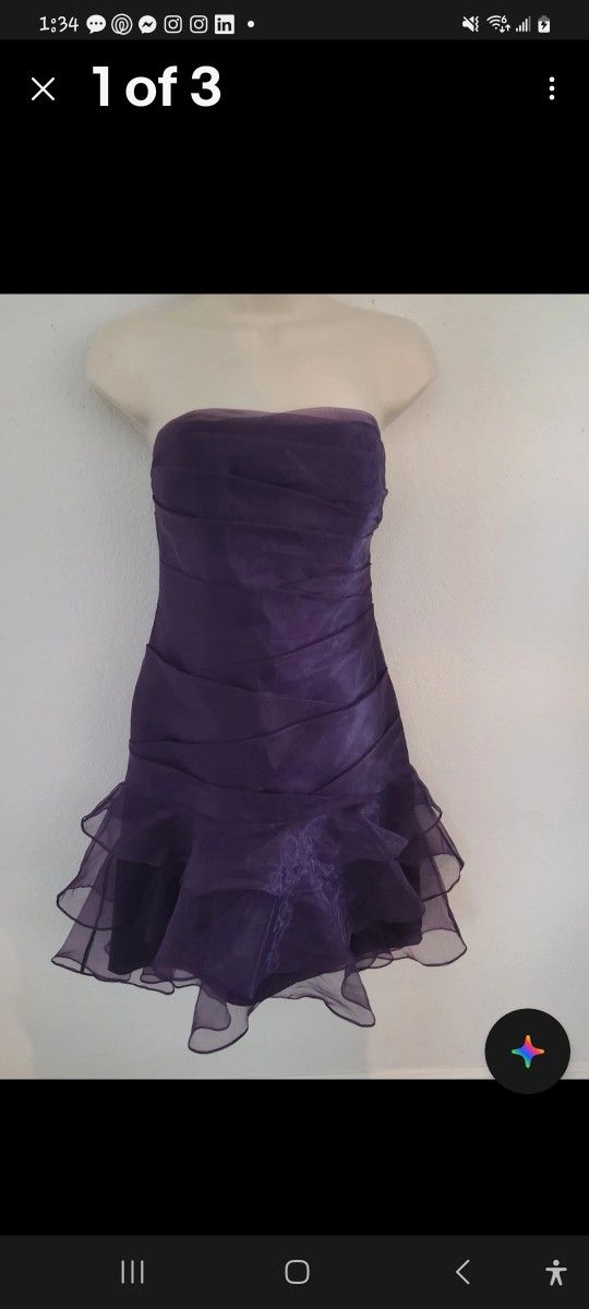 This is a David's Bridal strapless dress in size 4, featuring a purple color and sleeveless design. The dress has a layered ruffle style and is made of polyester material. It is suitable for various occasions such as prom, bridesmaid duties, or formal events. Personalization options are not available for this dress.