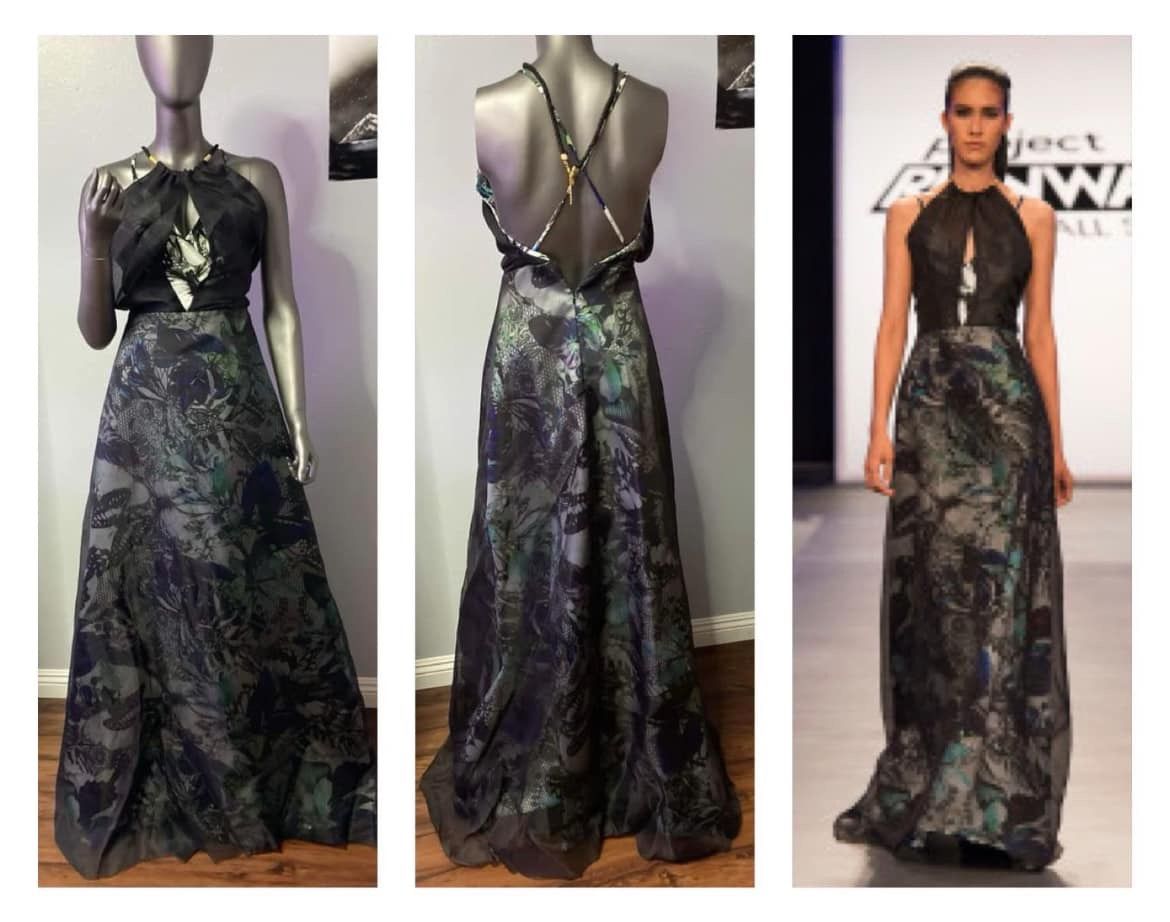 - TV WARDROBE - TV - Project Runway All Stars DRESS from SEASON 6 EPISODE 5 Info: S6 EP5 "Fashions New Superheroes" - Garment #665 (Designer Stanley). The theme of the challenge was to create an elegant look that celebrates a woman's inner superhero by using a Rodial product as the secret power inspiration. Stanley's Rodial inspiration was Smokey. He designed a long halter - neck gown with a black rope tie and criss-cross strapped back. The entire dress has an outer layer of black chiffon with a green, blue and white butterfly patterned fabric that is visible from the inside out through the chiffon. Note: These dresses were custom made for the models on the show therefore no sizes or markings shown, my guess is size XS/S.. Comes with CERTIFICATION! $60 obo