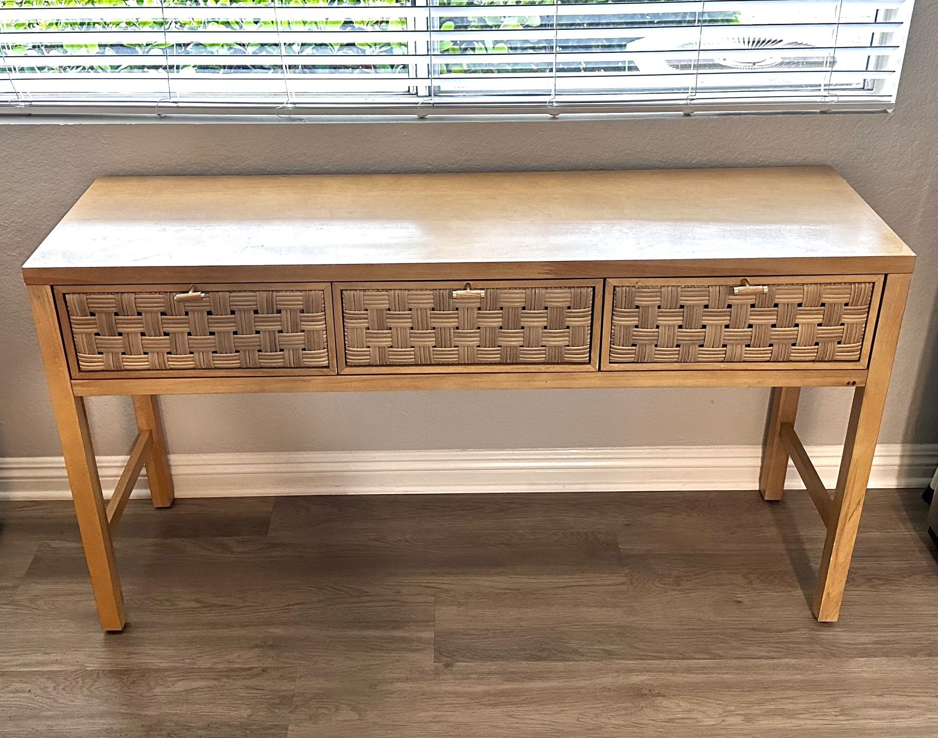 My wife and I are selling this rattan console table as we just moved and no longer have space for it. It’s in pretty good condition minus a few small scratches and the missing gold caps on the left drawer handle. Let me know if interested!