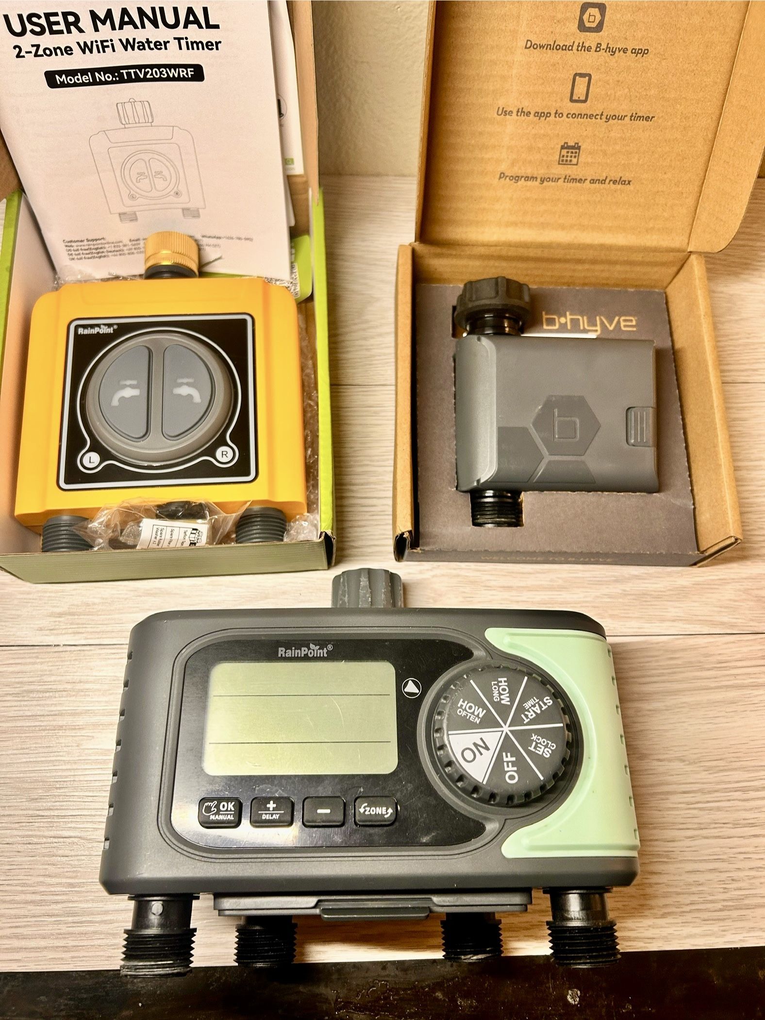 Description (New) RainPoint WiFi Sprinkler Timer 2-Zone - Timer Only, Without WiFi Hub (Like new) orbit bhyve gen 2 (Used) RainPoint 4 zone digital water timer All 3 for $100 Cheap great deal