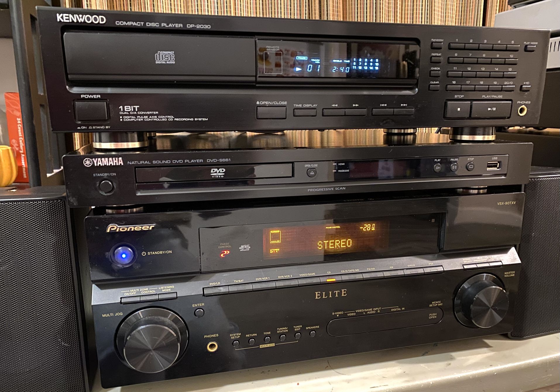 Pioneer “Elite” VSX-90TXV Stereo/7.1 Dolby~Surround Receiver with a minimum 110 watts per channel x 7 @8 ohms/150 wpc @4 ohms… Power, Beauty, & Excellent Sound would best describe this A/V Receiver… Being both Digital: HDMI/HD-Component/Optical+Coaxial Digi-Audio… And fully Analog Input/Output for your Legacy Components… So whether you do Home-Theatre/Gaming to the max, or Primarily Music from various sources/formats… This Pioneer does it all… Comes with Universal Remote… $125… Black Yamaha Rotel Nakamichi Integra Onkyo Sony JVC Sony Kenwood Receiver Home-Theatre Multi-Channel Controller Multi-Zone Top-of-the-Line