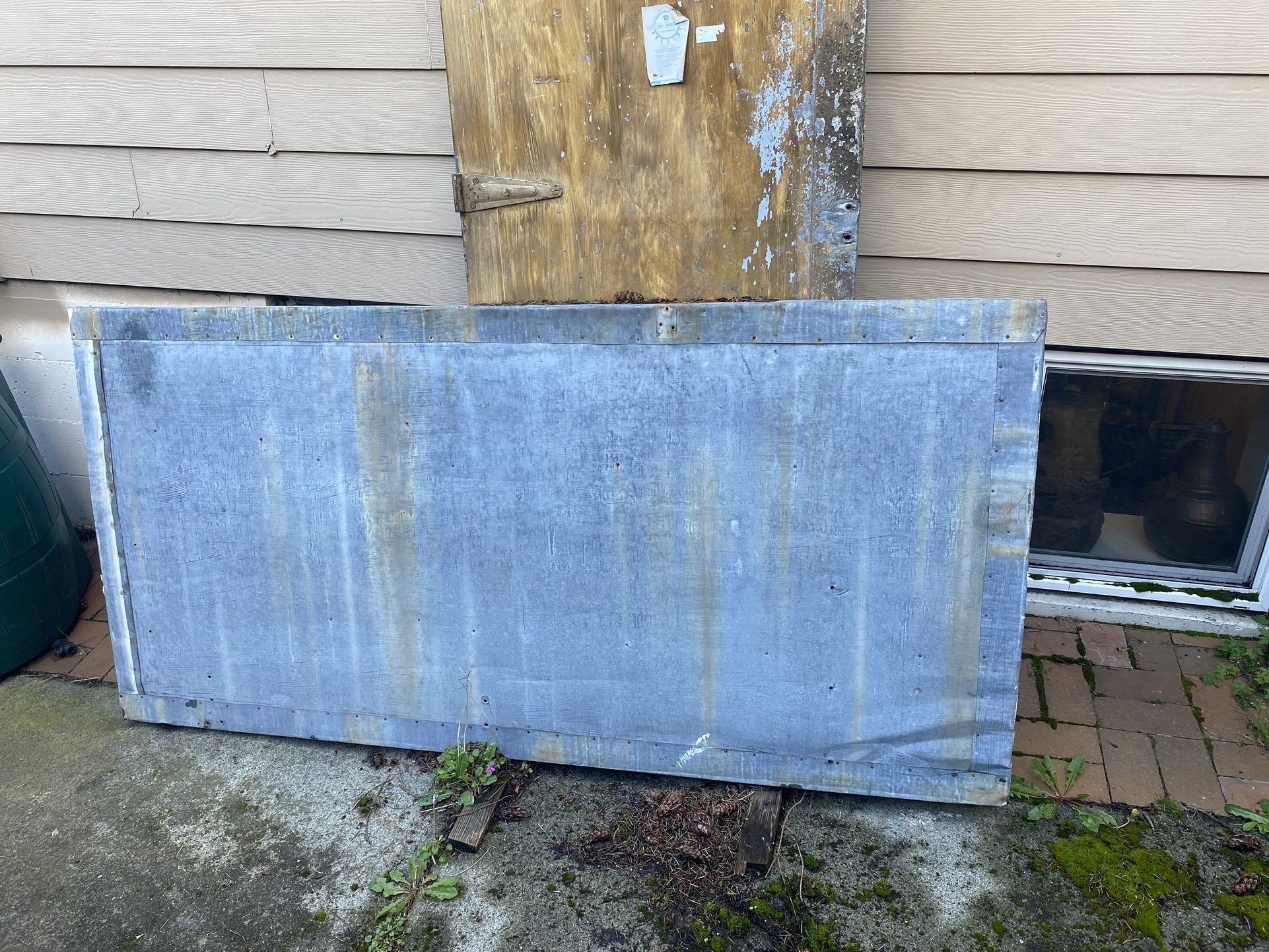 The galvanized door is clad on just one side and measures 77”x38” The 4 other doors measure 82.5”x29.5”