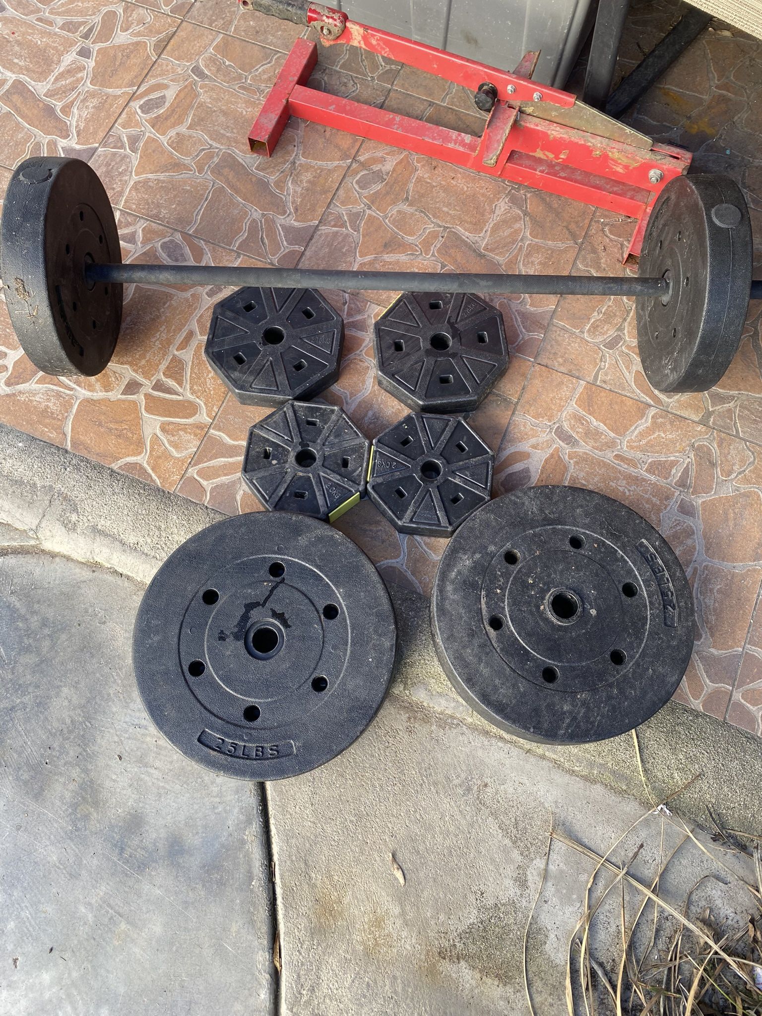 Total 8 weights. 2x2lbs. 2x15lbs. 2x2.0kg. 2x 2.75 kg. Total 8 weights plus the bar