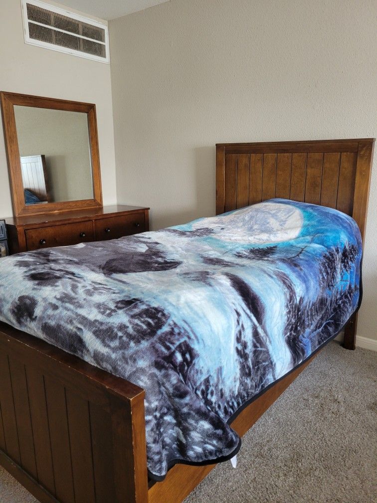 Wooden Twin Bed Frame + Dresser + Mirror