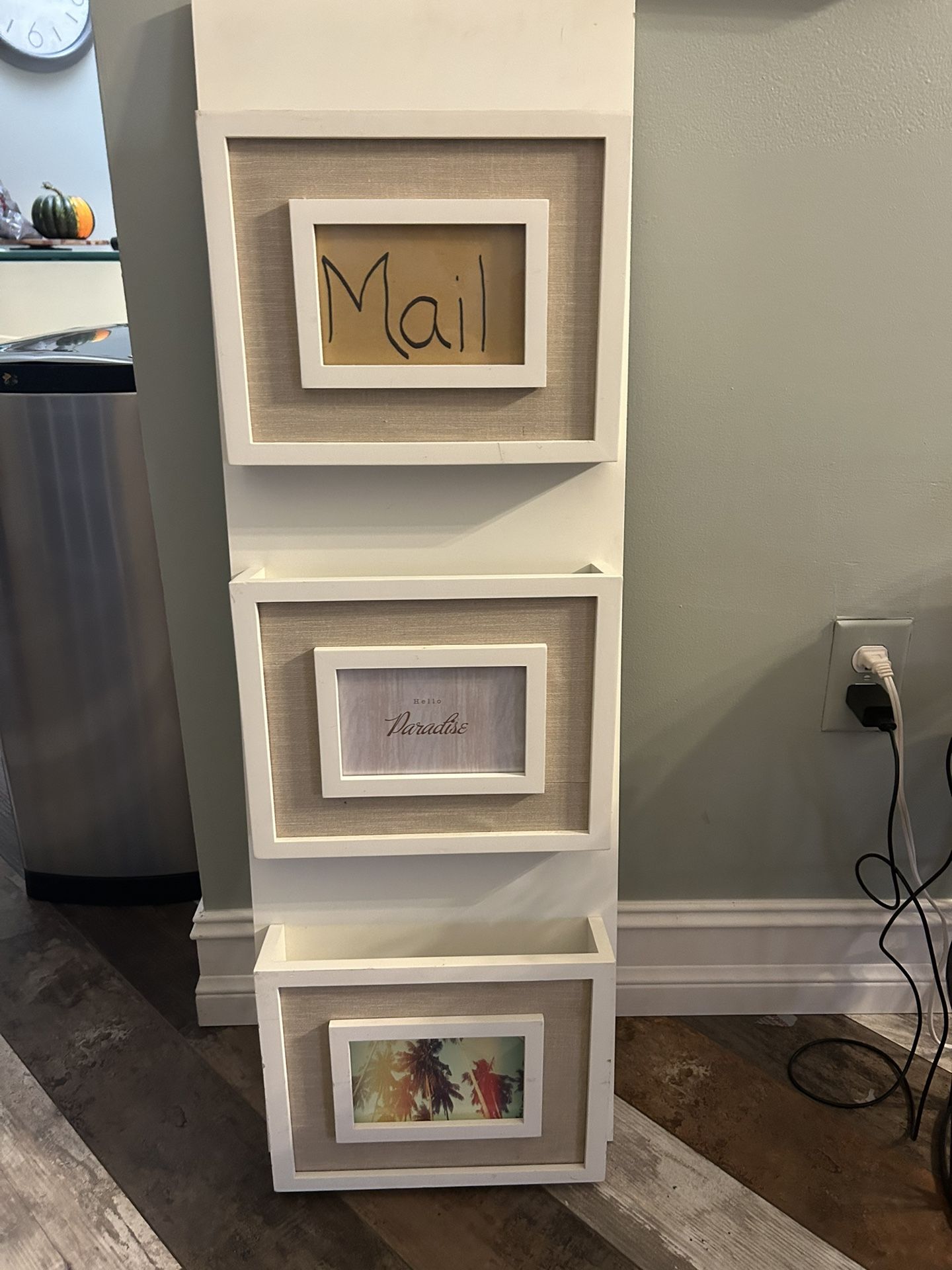 Wood bins with fabric backing. Large slots for organizing. 1’x 3’