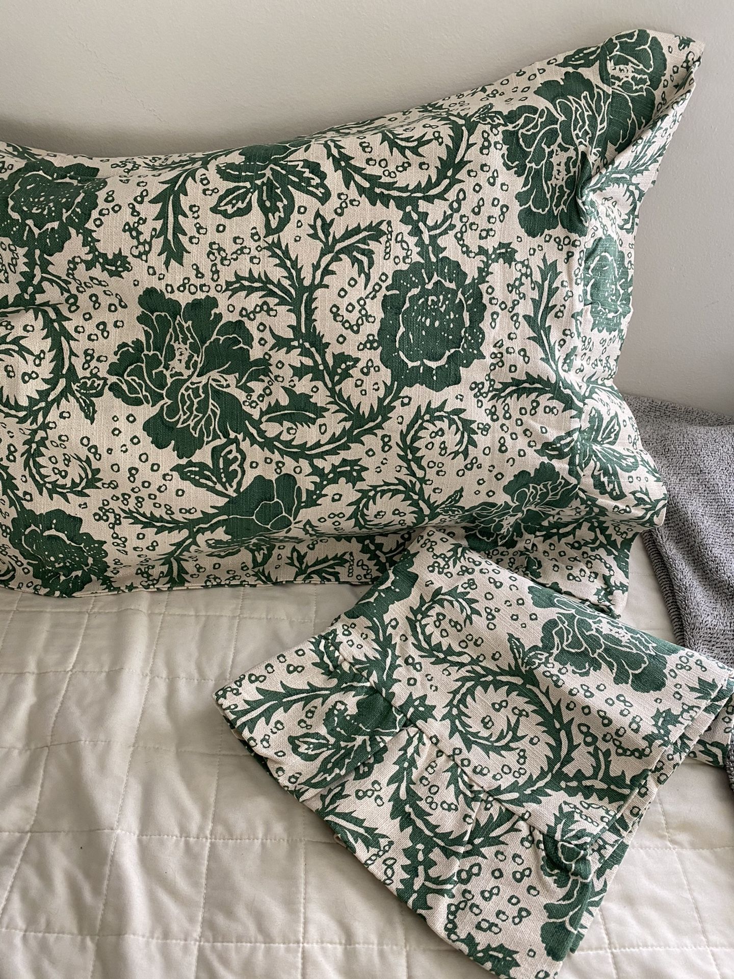 Perfect condition, brand new, never used Queen size pillow shams. Colors are a nice forest floral green with a cream/khaki background. Asking $20 for the set