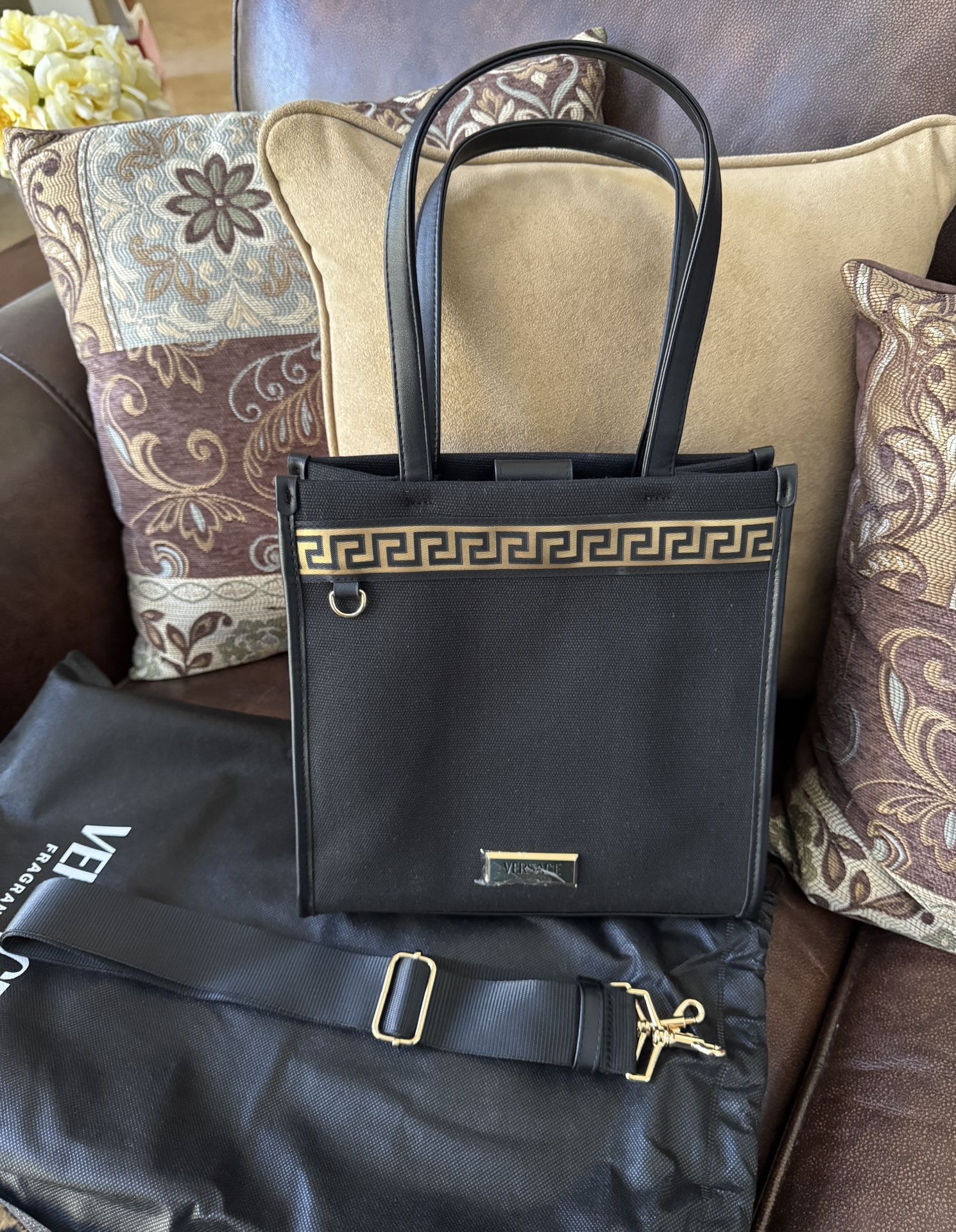 Versace Fragrances Black fabric with gold design Bag measures approximately: 10” x 9 3/4” x 5” Double strap with drop of 7” Cones with Crossbody strap Inside zipper compartment Inside 2 open pockets Bag has magnetic snap closure New, comes in original plastic packaging