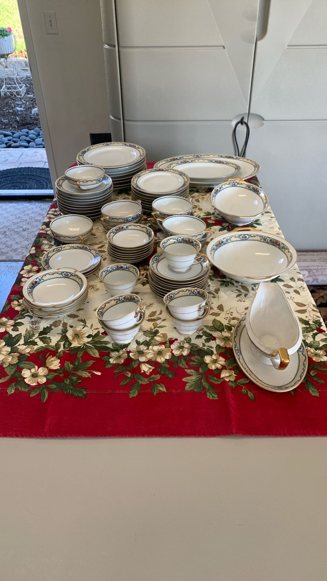 Bavarian China 8 Place Setting. Delmonte Pattern. Includes dinner and salad plates. Soup, fruit and bread and butter. Gravy Boat, 16” and11”serving plater.