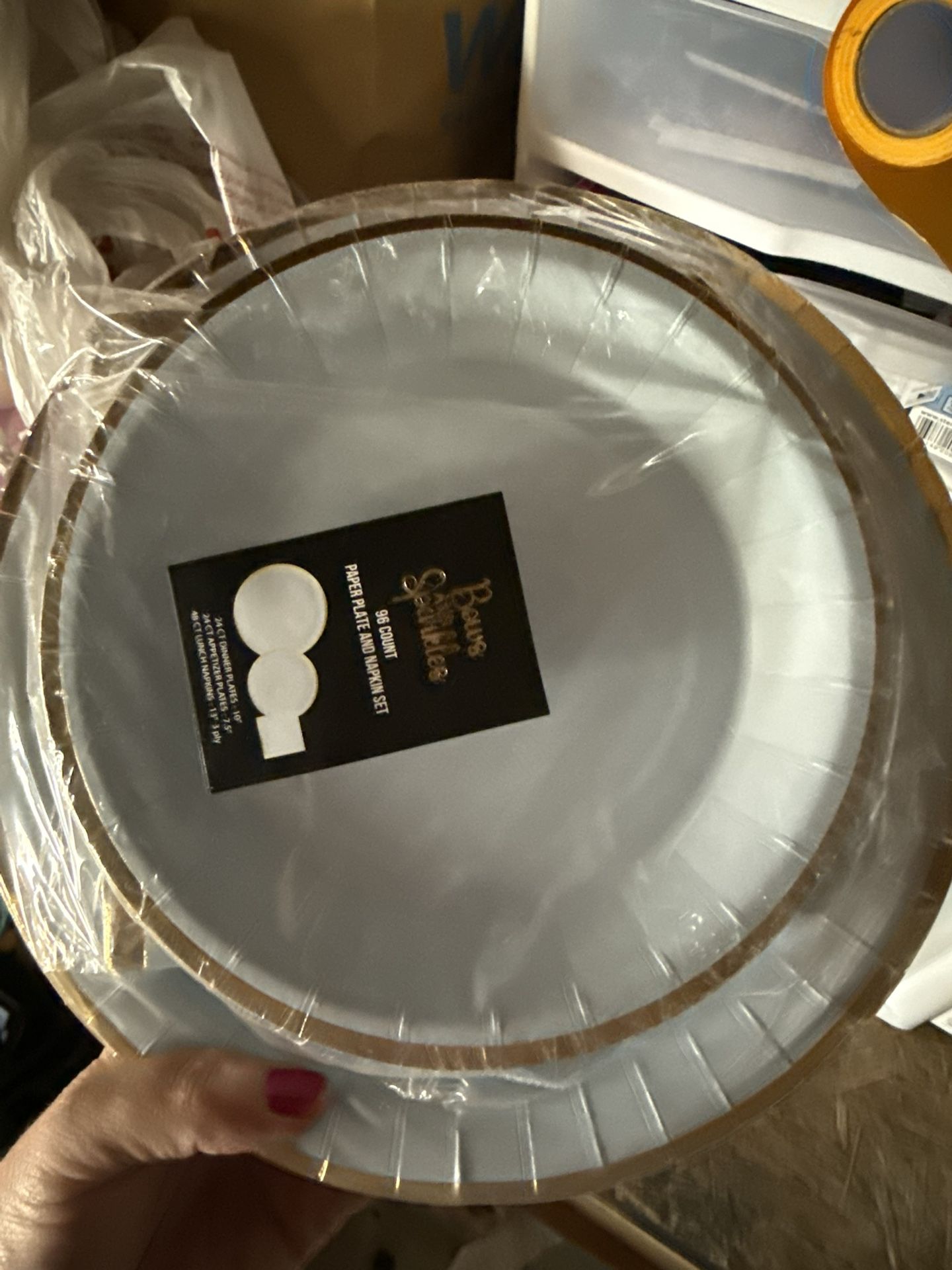 Party plates. Light blue with gold trim. 24 large plates, 24 small plates, 48 napkins in each pack. Have 3 packs total.