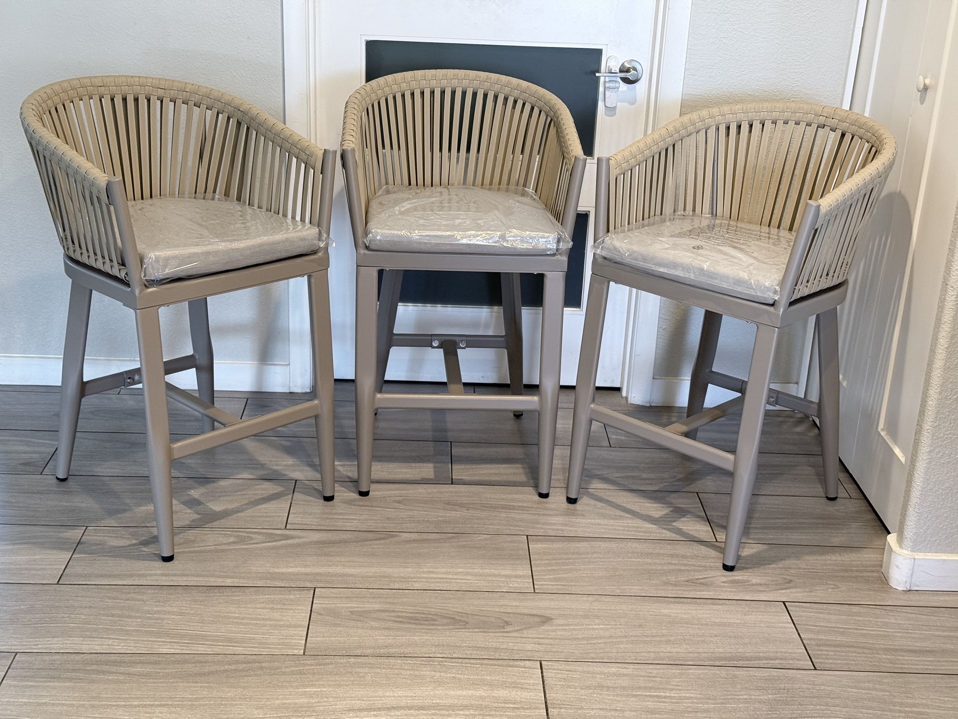 SET OF 3 PURPLE LEAF Modern Aluminum PE Rattan Counter Height Outdoor Bar Stool with Back and Beige Cushion ( Brand New And Assembled ) Retails $603 For All 3 Stools , Selling The Set Of 3 For $350