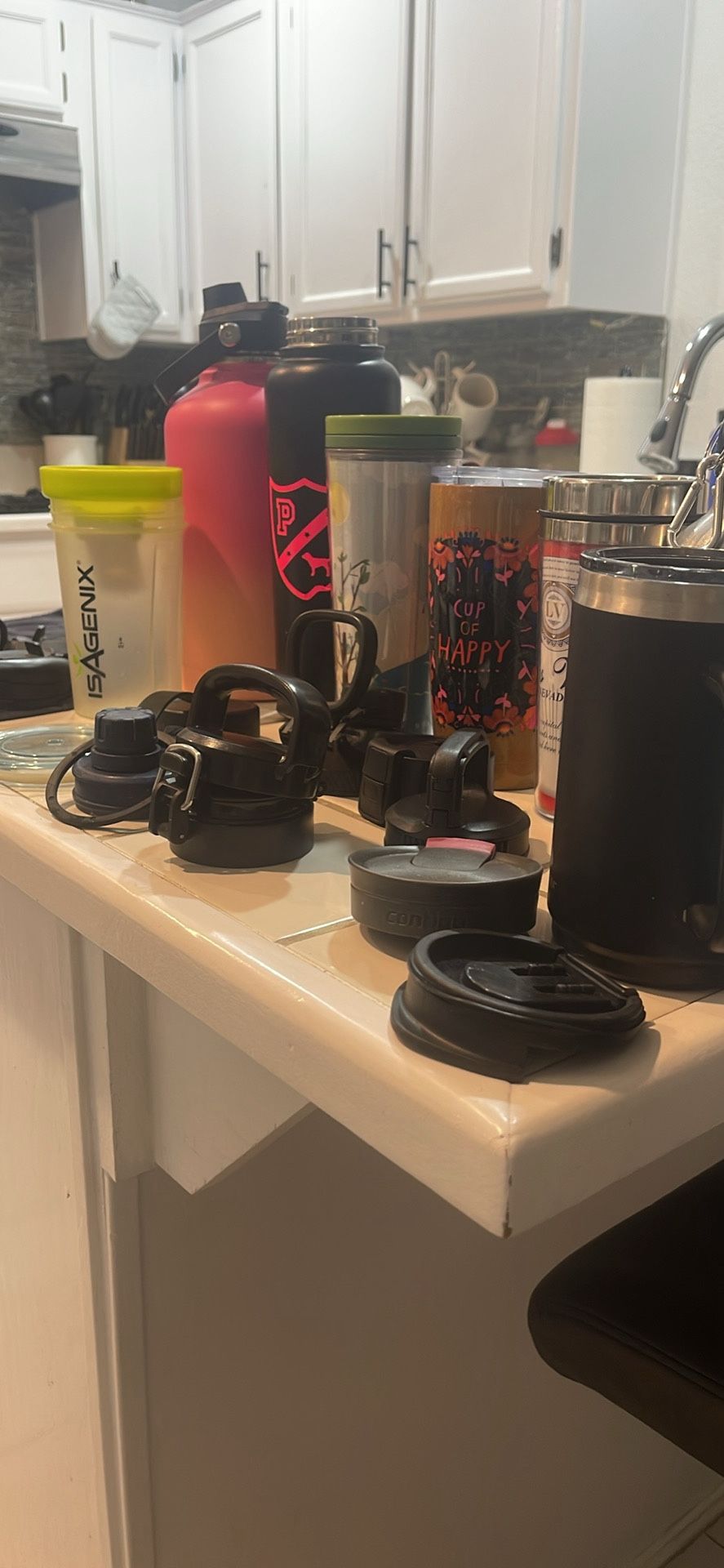 Bundle of bottles of water coffee cups shakers are a bunch of leaves that one doesn’t have a top