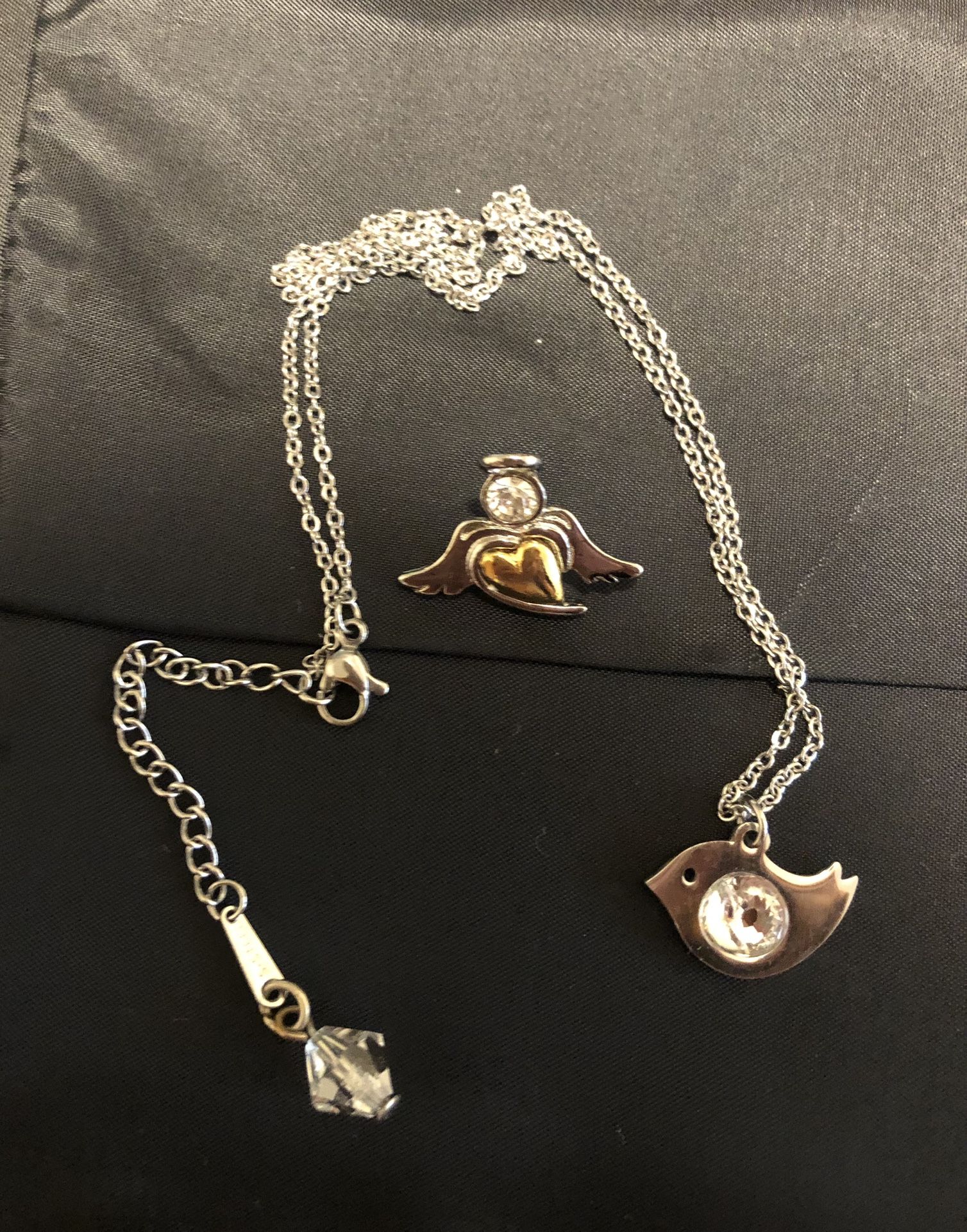 Dove with rhinestone necklace/ Surgical Steal 9”. Angel heart pin 1” x 1/2”. Beautiful condition and wonderful pieces to promote hope.