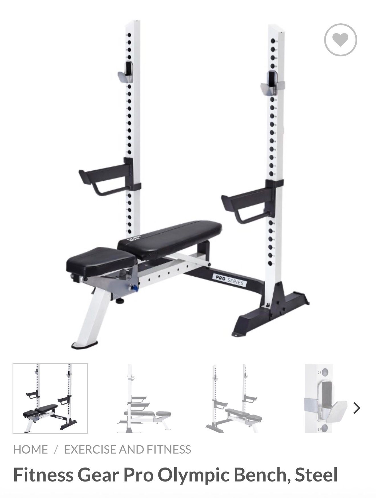 * Note: It is currently disassembled for easy transport. Stock photos are included to show what it looks like fully set up. All parts are included. Fitness Gear Pro Olympic Bench Solid Olympic bench press setup from Dick’s Sporting Goods. Includes built-in rack and safety catches. Great for home gym workouts (bench press, chest, arms, etc). Sturdy steel frame. Good condition. Pickup only.