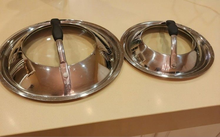 Set of 2 stainless and glass lids in excellent condition 9.5" and 7 5" in diamtere
