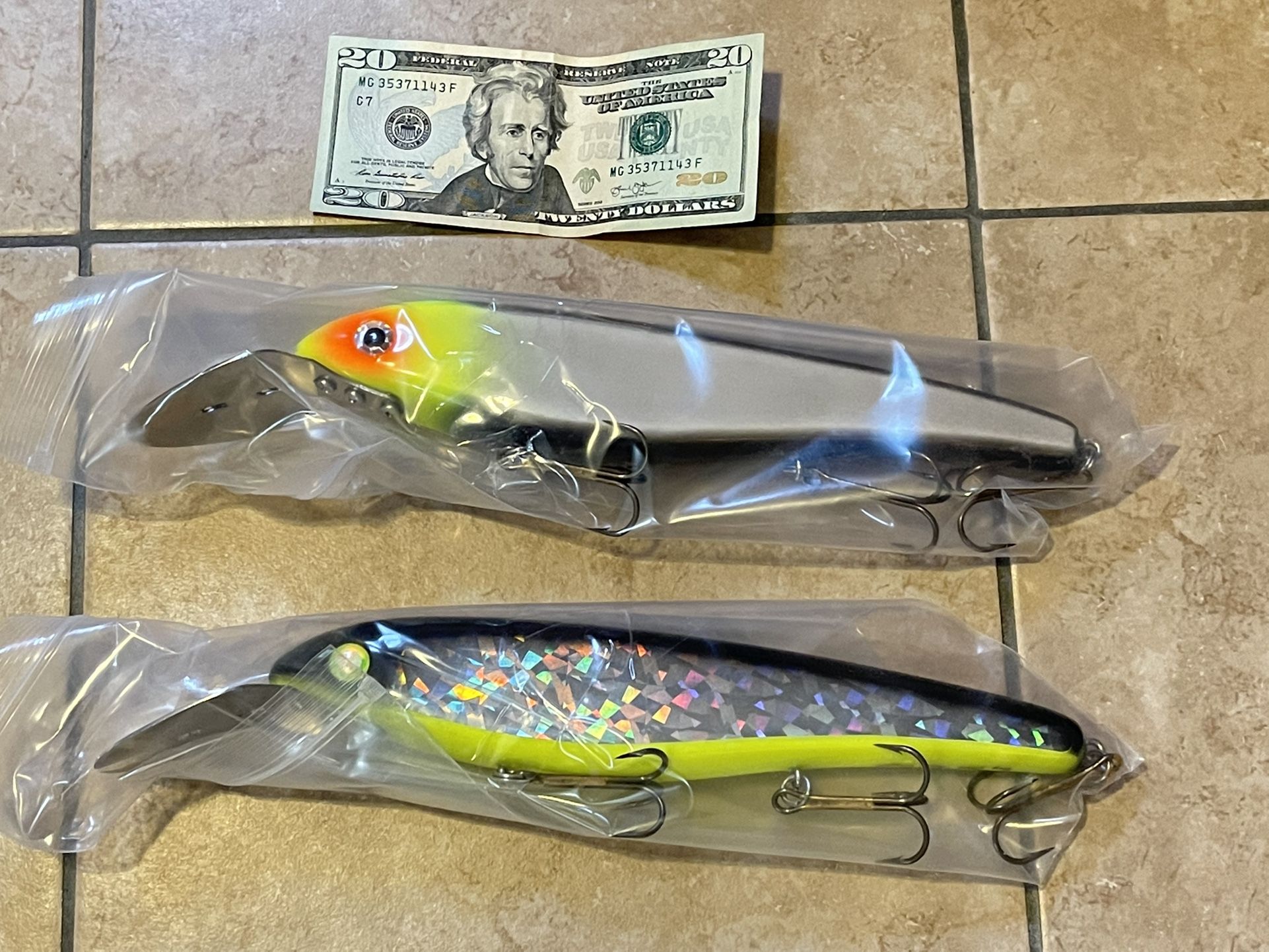 Brand new musky lures 12” Cedar wood diver. 2 settings 10-12’ and 25-30’ 7.2oz. 5/0 XX VMCs on them with T’ed belly hooks to protect the high build epoxy. $130 for both