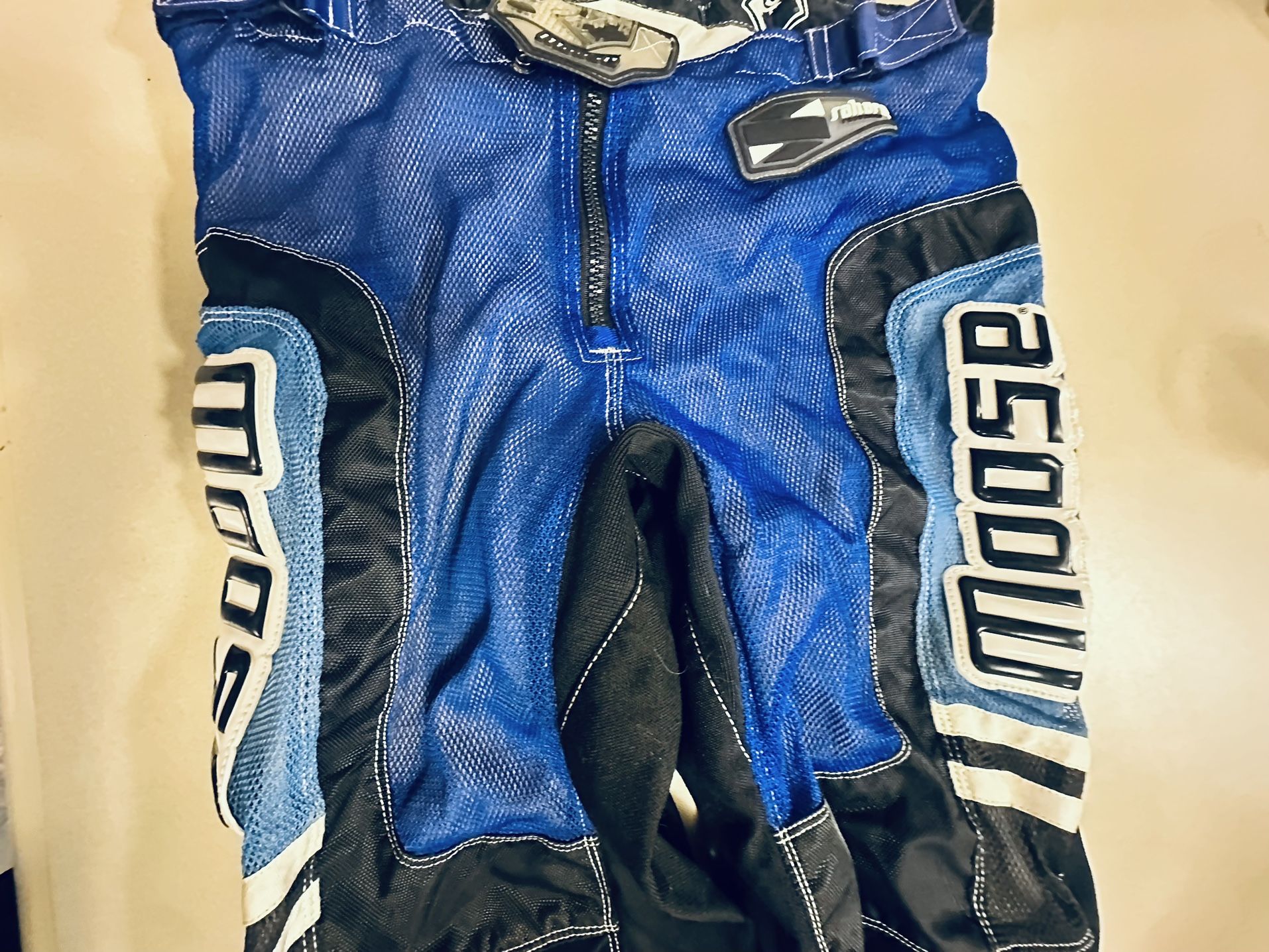 Protective Moose motocross pants. Blue and black colors. Has mesh panels for good ventilation and padded areas for rider protection. Great for dirt biking or off-road adventures.