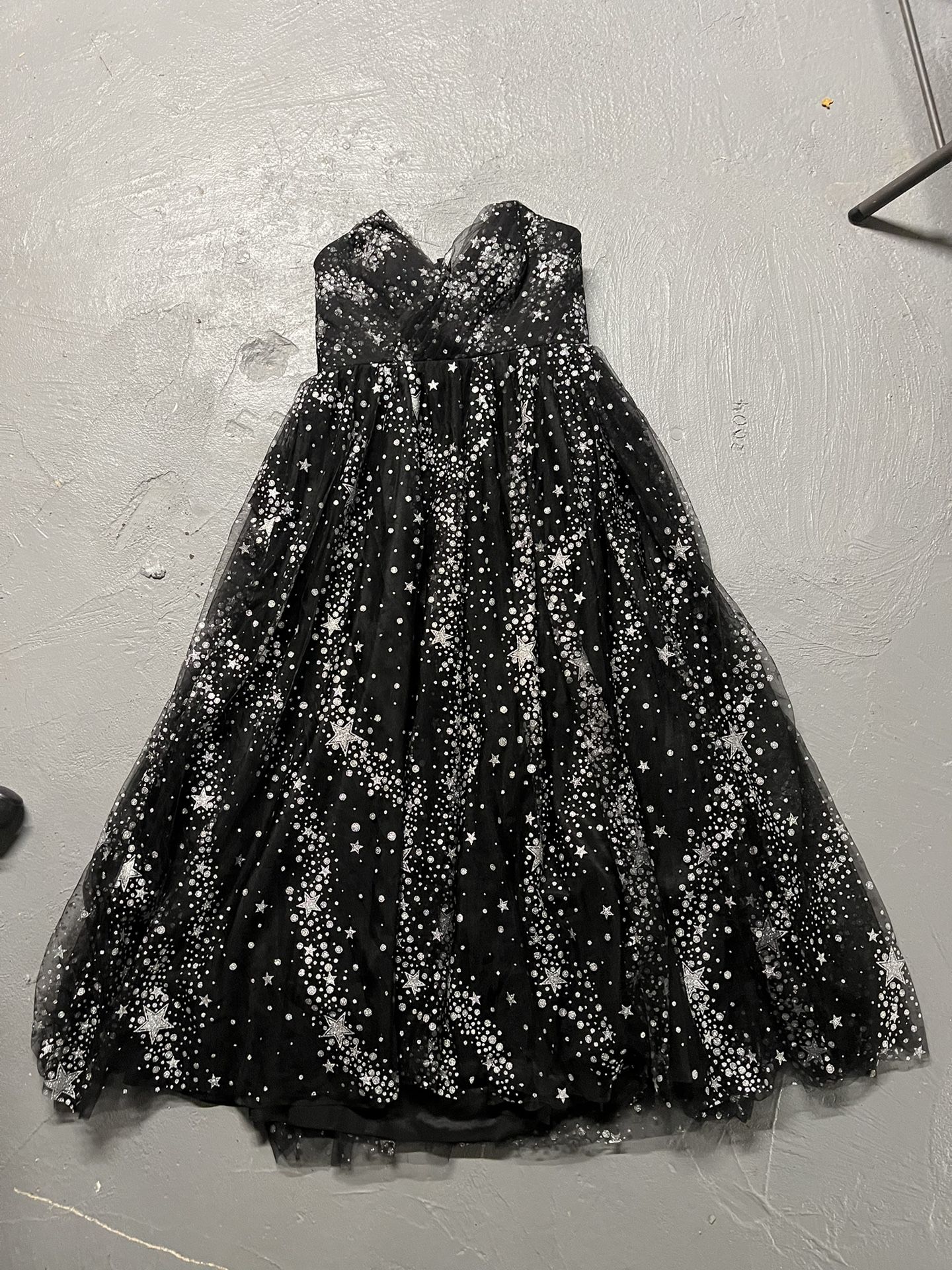 Color: Black with silver stars ⭐️ Size: Large (Sweetheart neckline dress) On the back, you must tie with laces.