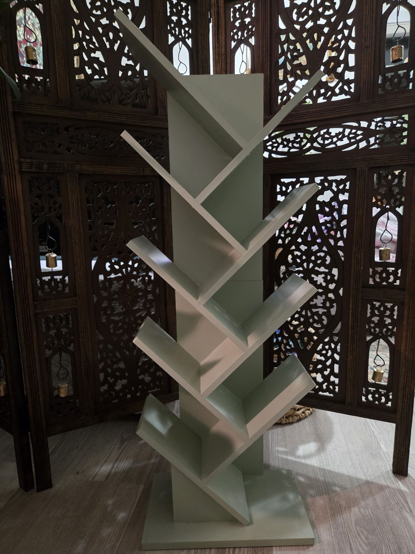 Painted light green Book Tree bookshelf with a bold big‑zag, branch‑style design. Sculptural look with multiple angled shelves for books, plants, or décor. Stable and in great condition, only minor signs of wear in the book nooks. Smoke free home. Ready for pickup.