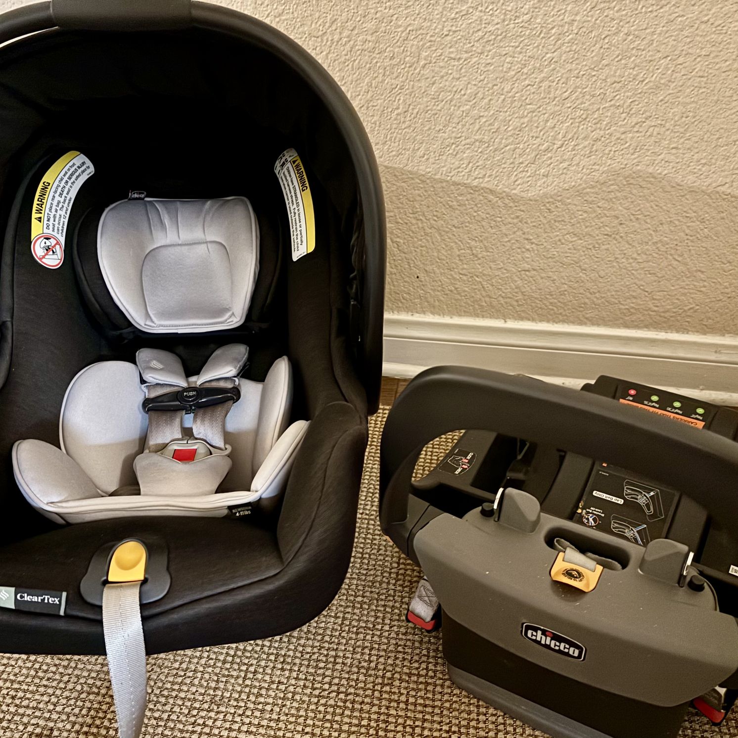 NEED GONE ASAP Used only a few times. In brand new condition. Comes with base. A removable infant head and body support insert creates a cozy car seat for newborn from 4 - 11 lbs. Weight/Height Range 4-35lbs/up to 32" Retails for $300. Chico fit 35 black and grey car seat with privacy shield zip open full coverage. TOP-RATED INFANT CAR SEAT – Simple, accurate and secure installation – every time – with two bubble level-indicators and spring-loaded leveling foot for proper base angle in vehicle seat and premium LATCH connector for easy attachment.