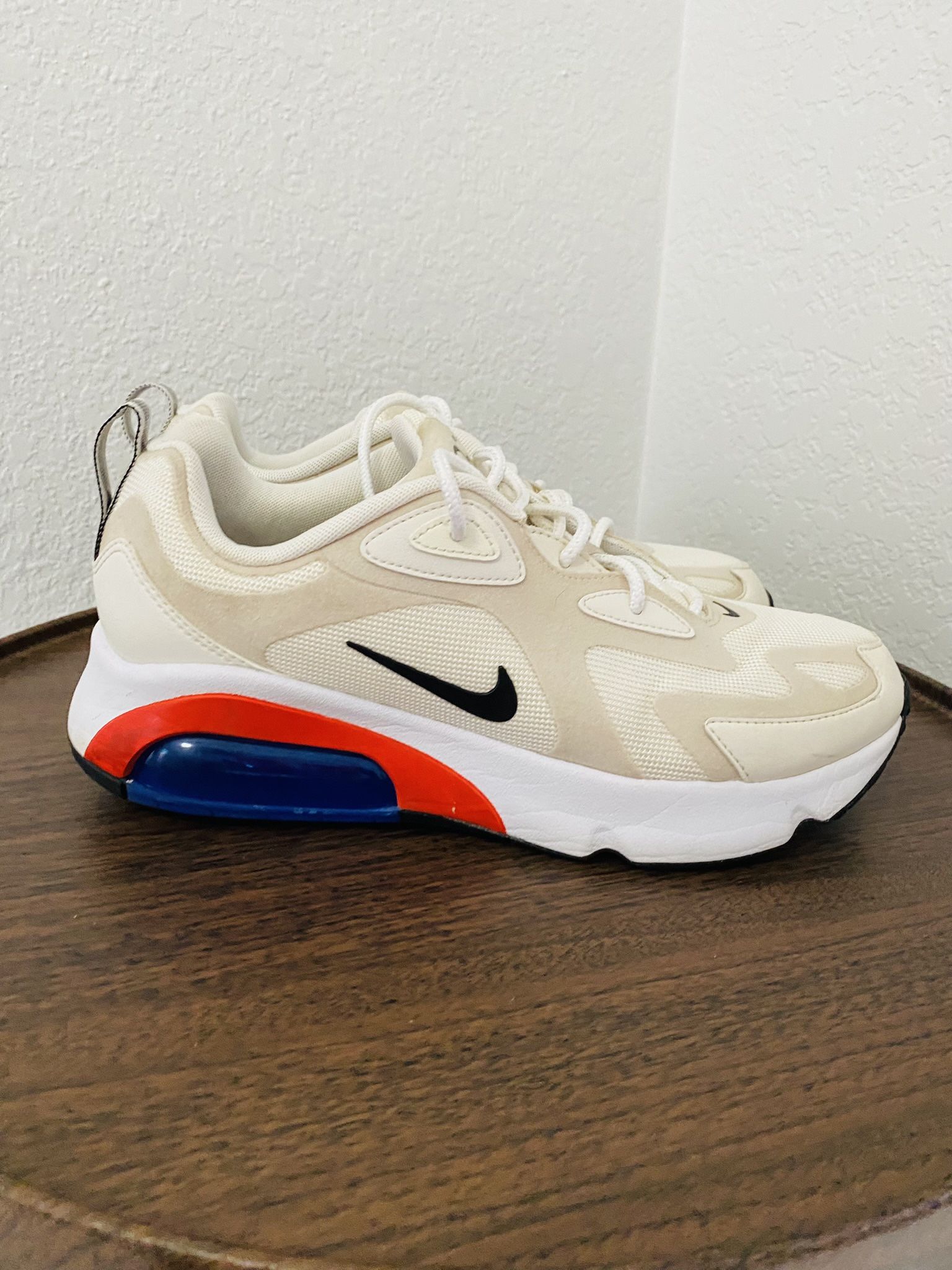 The Nike Air Max 200 "Desert Sand" (style AT6175- 100) features a beige upper with a contrasting red and blue sole unit. Perfect condition OLYMPIA PICK UP $30