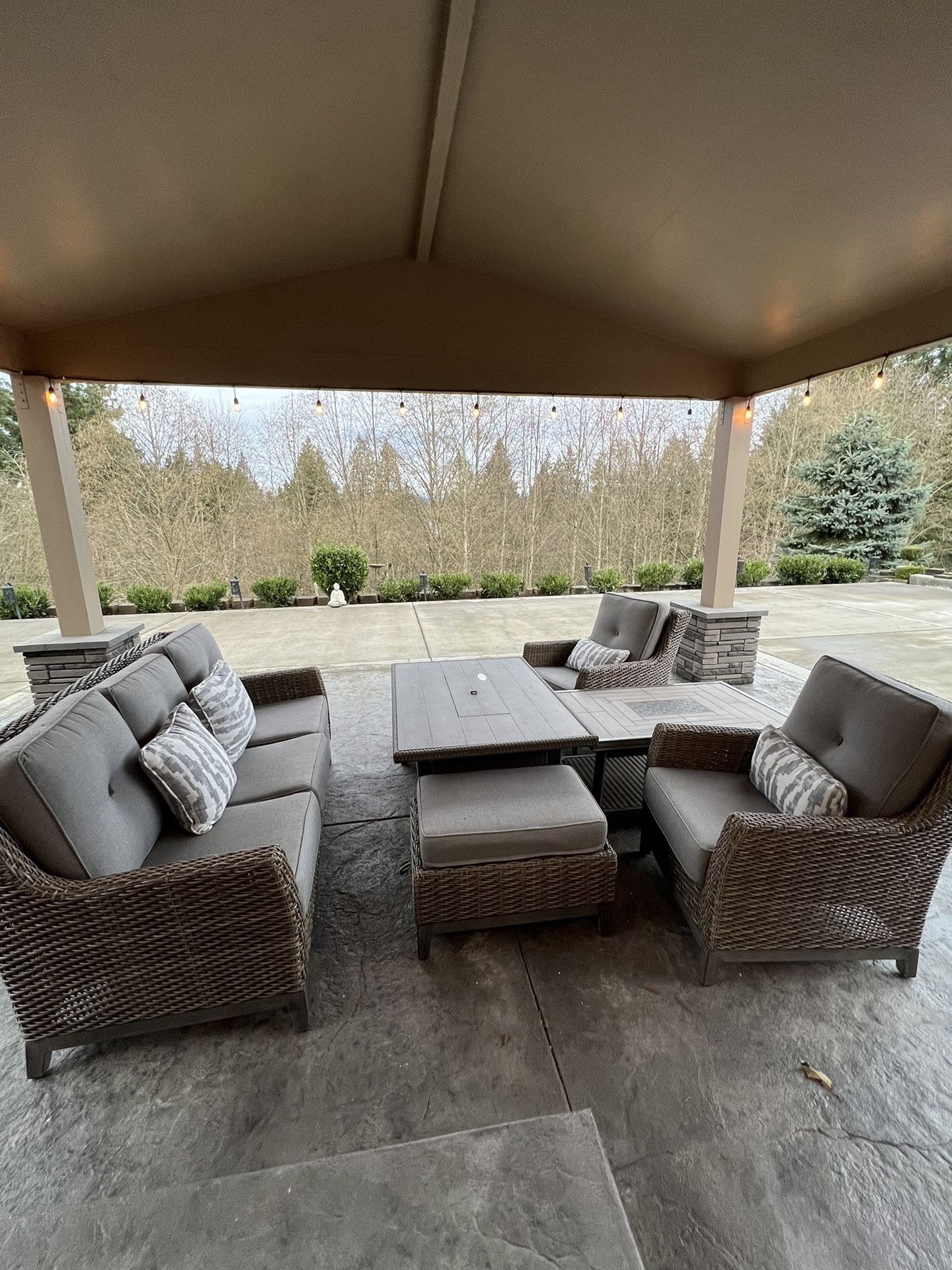 Set of 7 patio set, included 1 couch, 2 chairs, 2 ottomans, 1 table, and fire pit Originally from Costco