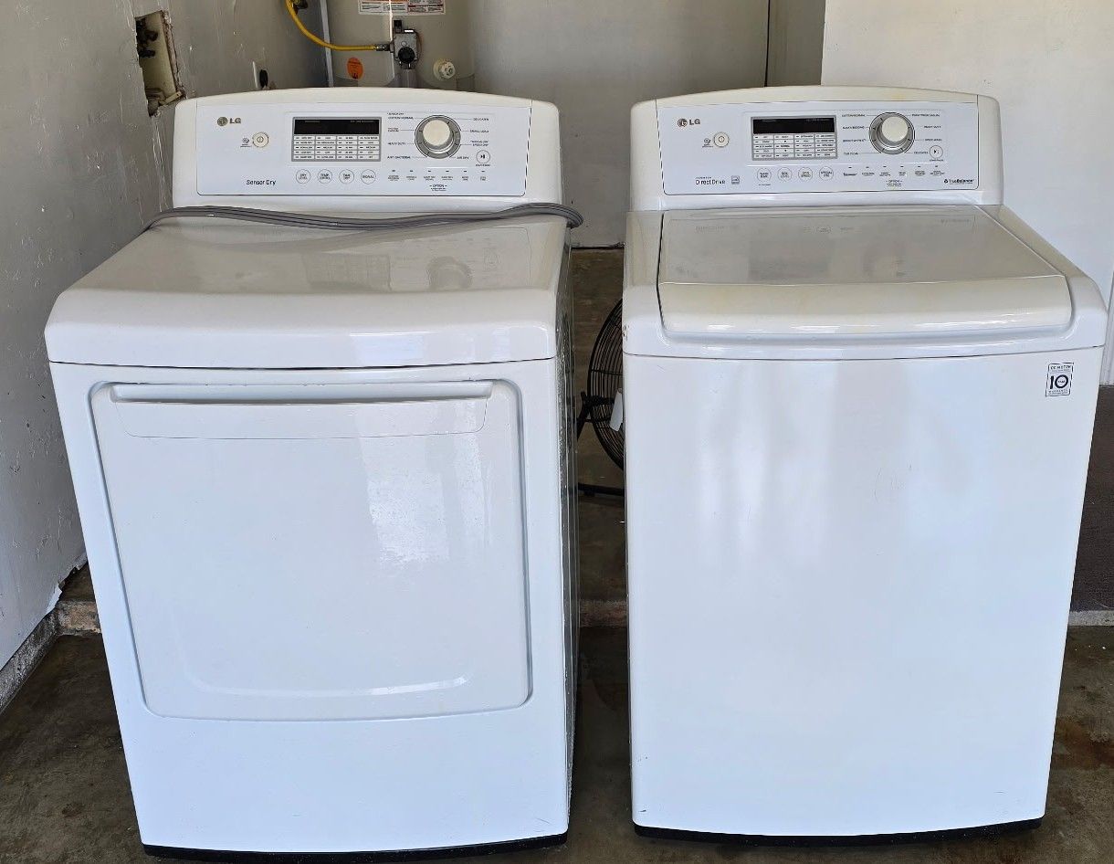 Matching LG top-load washer + dryer set with the front control panel, digital display, and large dial Washer: Top-load, likely 4.3–5.0 cu ft capacity Direct Drive motor (no belt = quieter + more durable) LG ES Multiple wash cycles + sensor-based load detection Energy-efficient compared to older agitator models Dryer: Likely Sensor Dry (automatically stops when clothes are dry) Multiple heat settings + wrinkle care options These were not cheap entry-level units and we're we're built to last a very long time. There are zero issues with them and you're welcome to test them out first. As a set, they cost $1,800 brand new. They work perfectly and we're selling for less than half that amount. This is a GREAT washer and dryer! Age is age and it does have a few rust spots so I dropped the price to $500 due to that, alone.