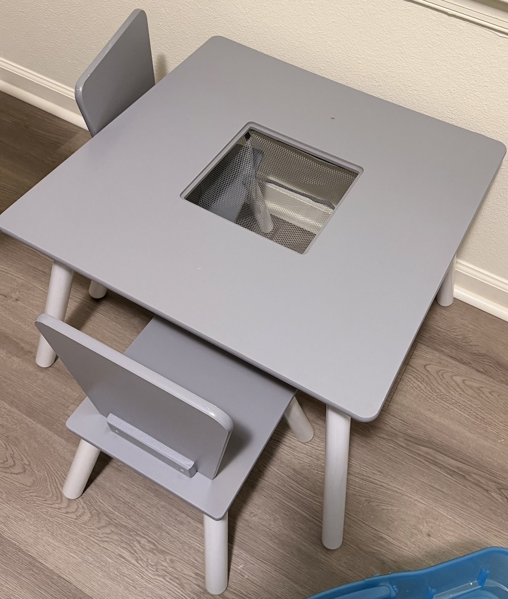 Delta kids table with 2 chairs. Has a mesh bag in the middle of the table. Missing cover for mesh area