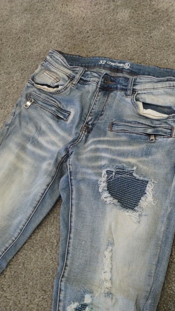 Two zipper pockets Four packets besides that Three distressed patches Awesome condition for used jeans You barely see Crysp denim anymore