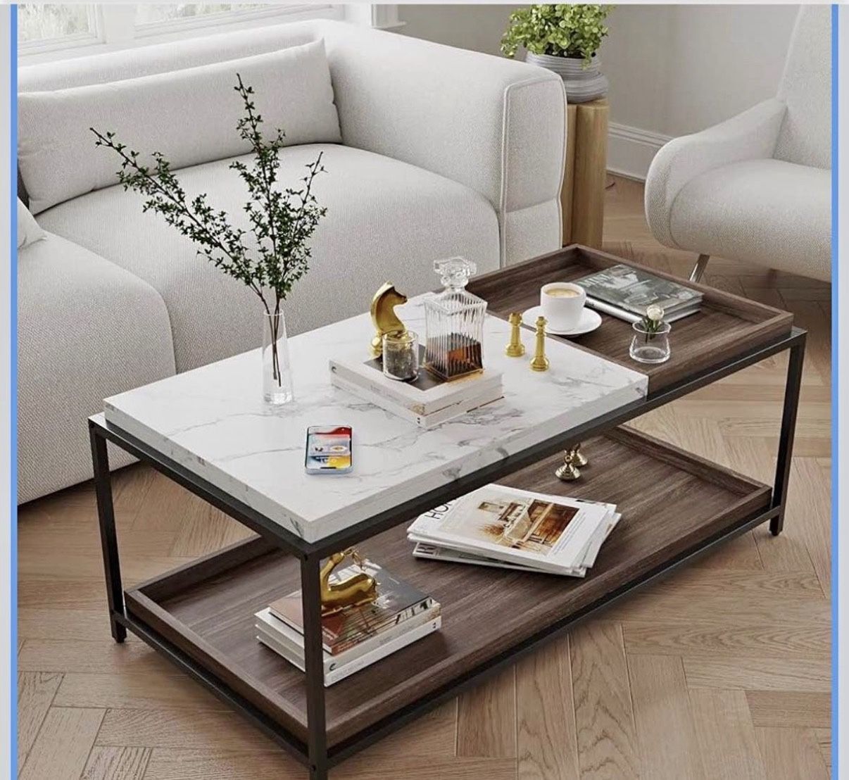Convertible Entertaining Coffee Table - Faux Marble With 2 Removable Trays, 47 Living Room Table, Mo