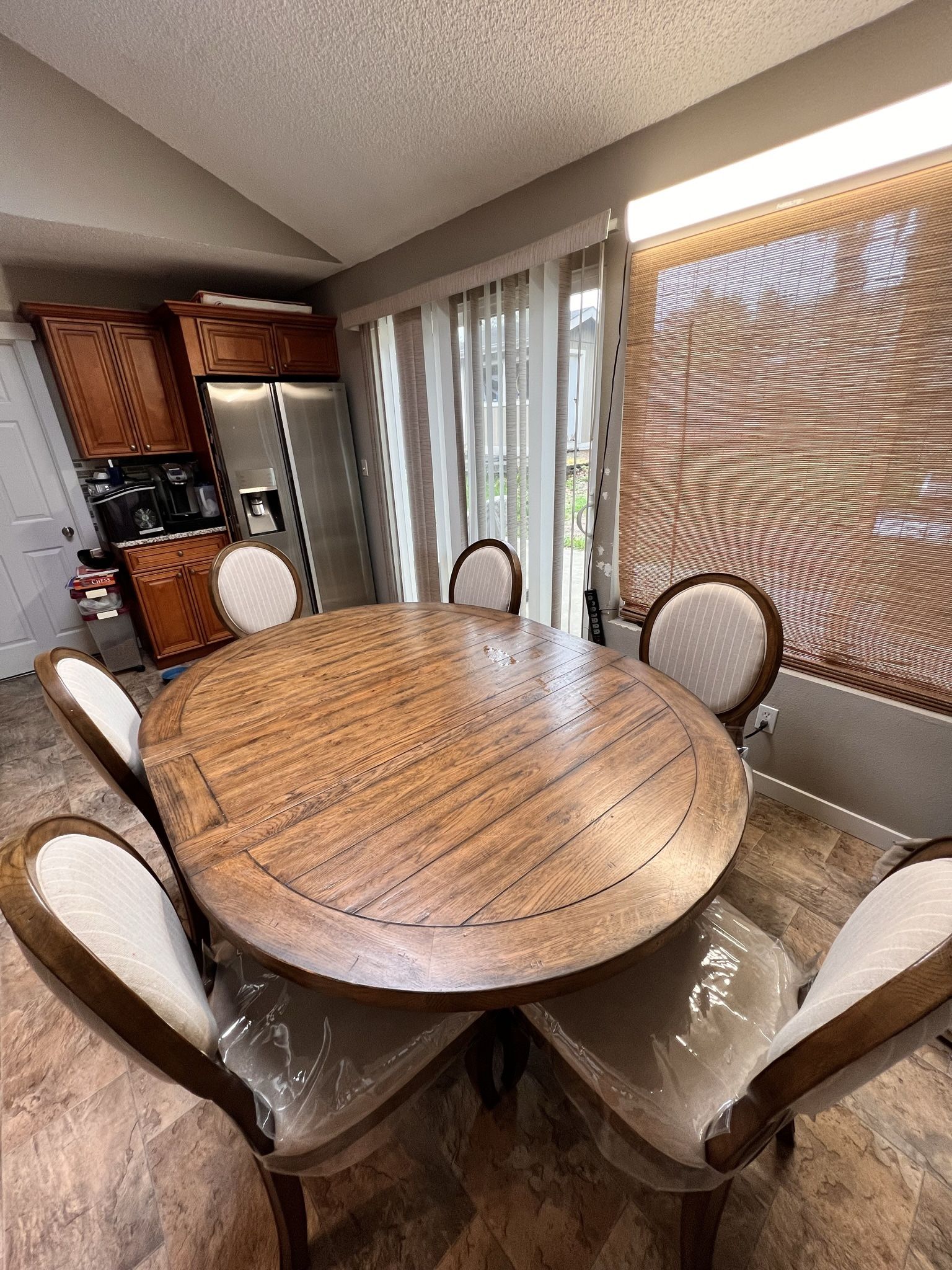 Dining set includes 6 chairs Expandable table from round to oval Made with real wood Solid hard wood sturdy and durable