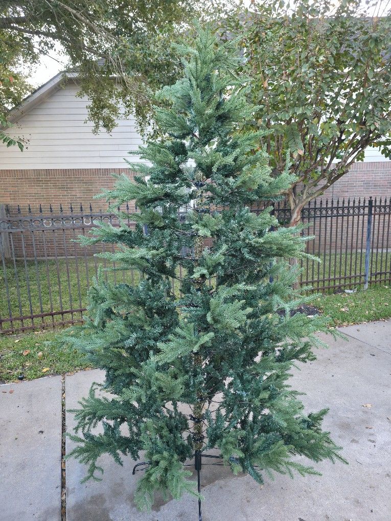 Christmas Tree is made by Homcom. 9ft tall. Christmas tree wasn't spread out when pictures were taken. Tree is like new. The holding box has some tears. We don't provide delivery. So you must have your own movers to take it.