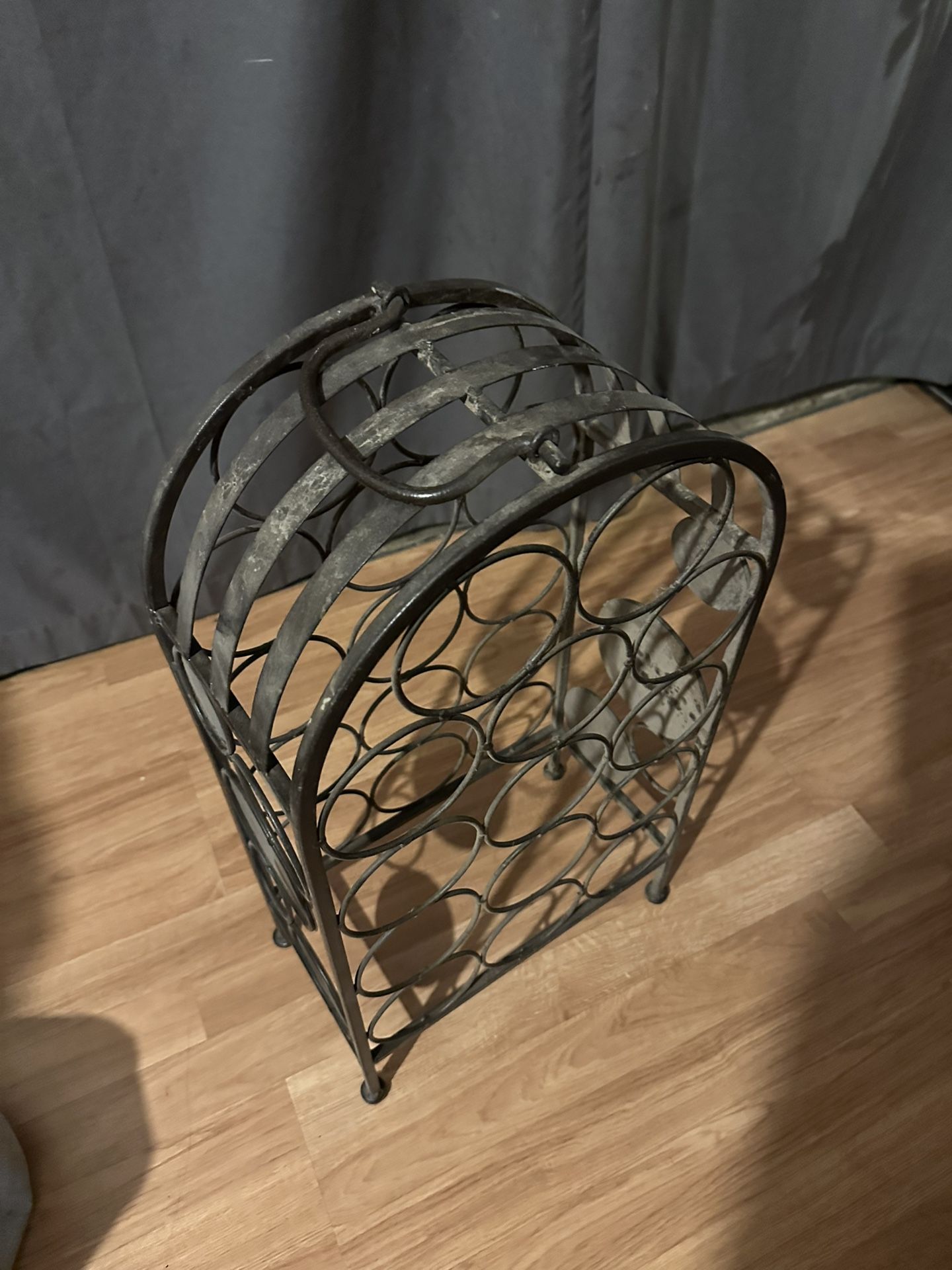 Metal wine rack with vintage style design. Holds multiple bottles. Sturdy and decorative. Normal wear from use. Great for kitchen, bar, or dining area.