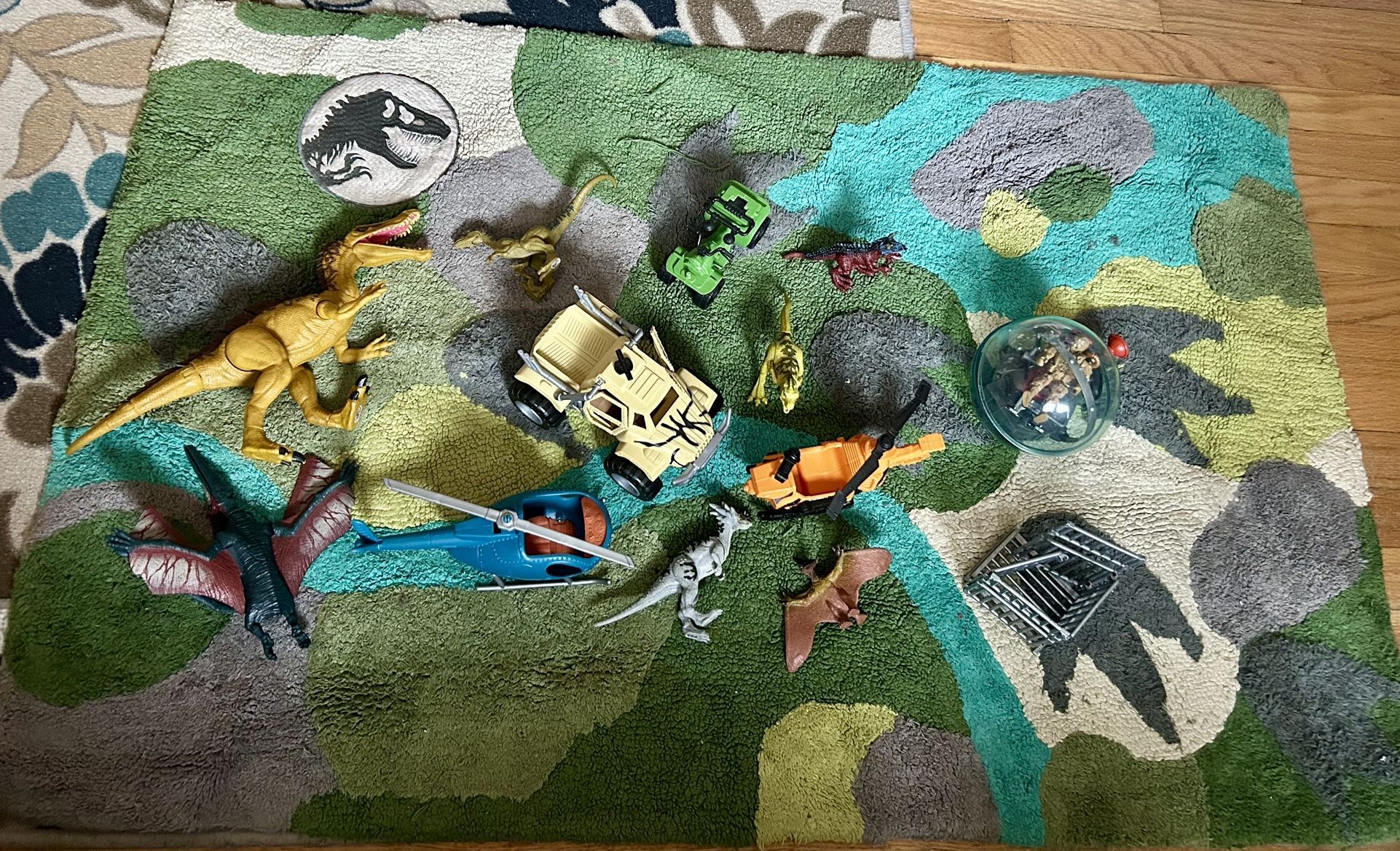 Selling a set of gently used Jurassic World toys! Includes various dinosaurs, a car, and a helicopter and more . Including the Jurassic World carpet for room (just needs a wash). Great for any young dinosaur enthusiast, my son loved them!