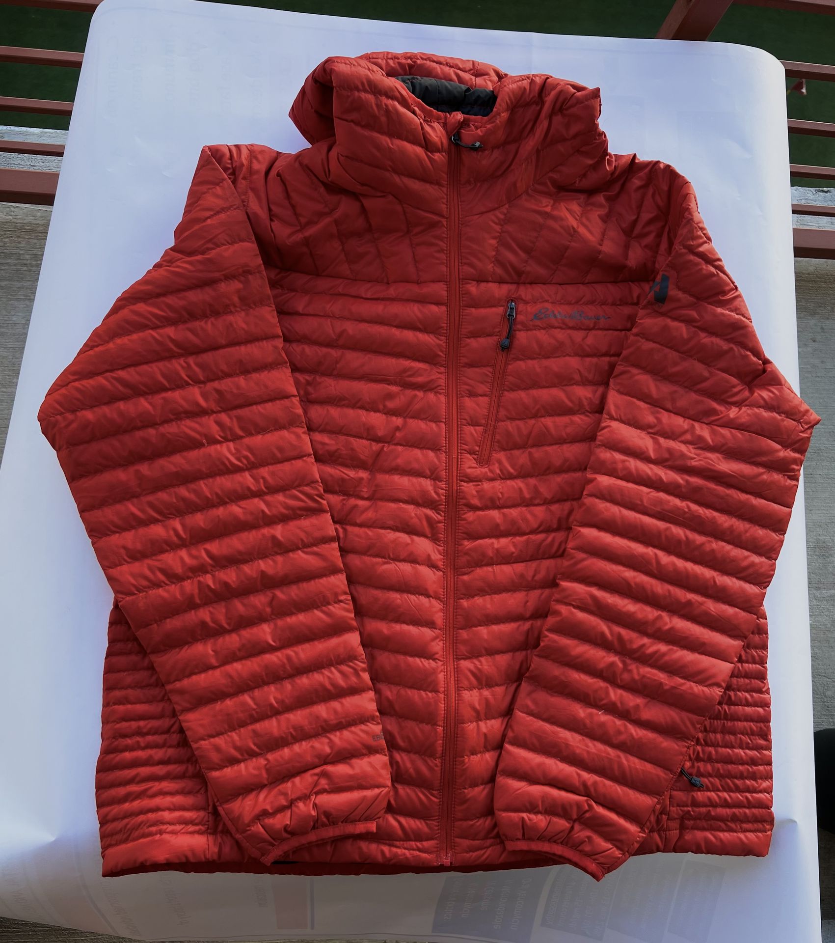 Brand/Line: Eddie Bauer – First Ascent Marking: EB800 (shown on jacket) Size: Men’s XL Color: Red Fabric tag: Pertex Quantum (visible inside) Features: hood, full-zip, zip chest pocket, zip hand pockets, lightweight puffer warmth Great for cold-weather everyday wear, travel, hiking, or layering.