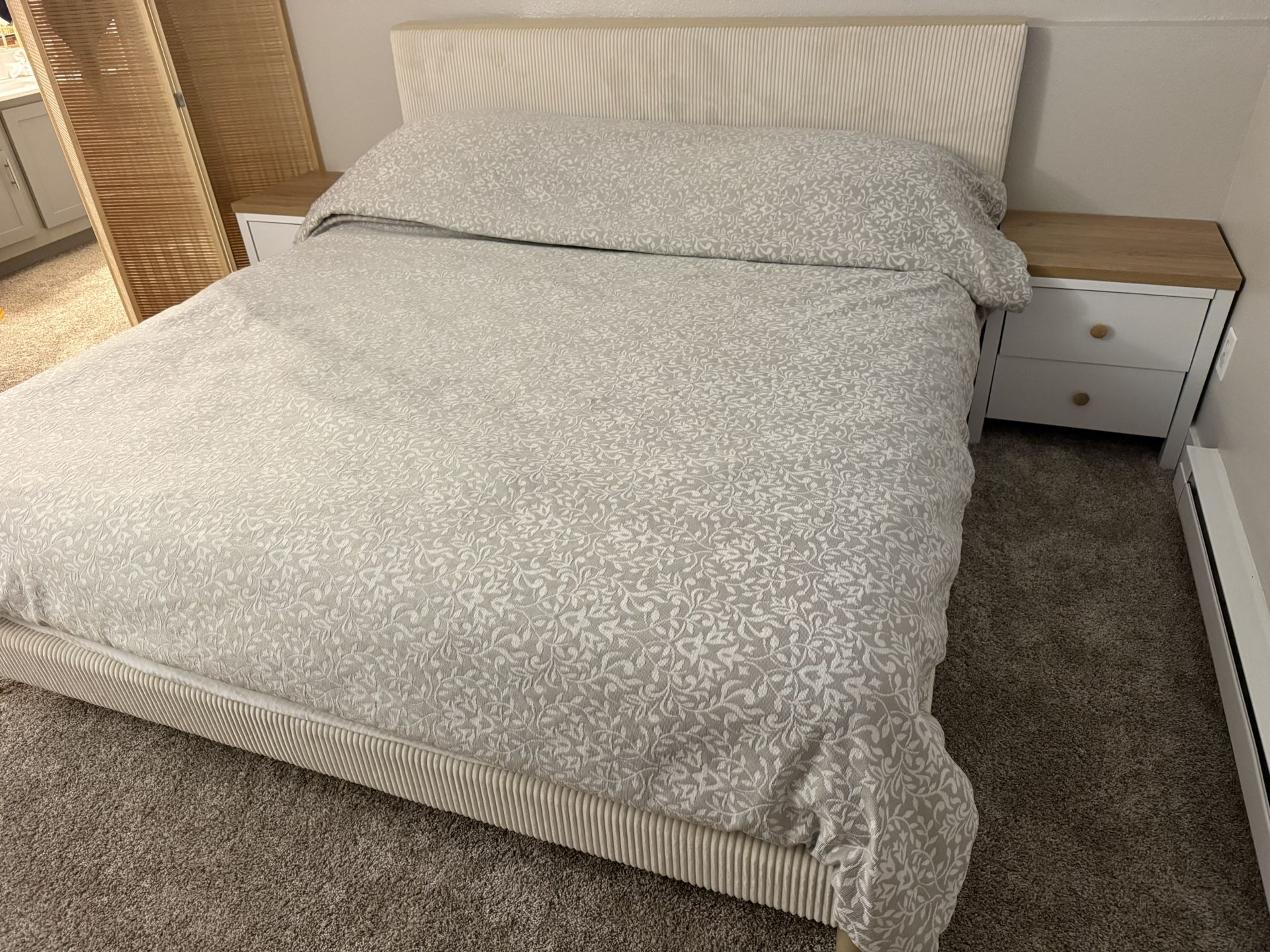 Bedroom set in excellent condition. Includes a Beautyrest PressureSmart Firm mattress, a modern upholstered bed frame with a soft beige headboard, and two matching nightstands with a light wood and white finish. The mattress is high-quality, firm, and very comfortable, perfect for anyone looking for great back support and a restful sleep. The frame is sturdy and elegant, matching perfectly with the nightstands for a clean, modern look. Everything is in perfect condition, with no stains, no sagging, and very light use. Perfect for a master or guest bedroom.