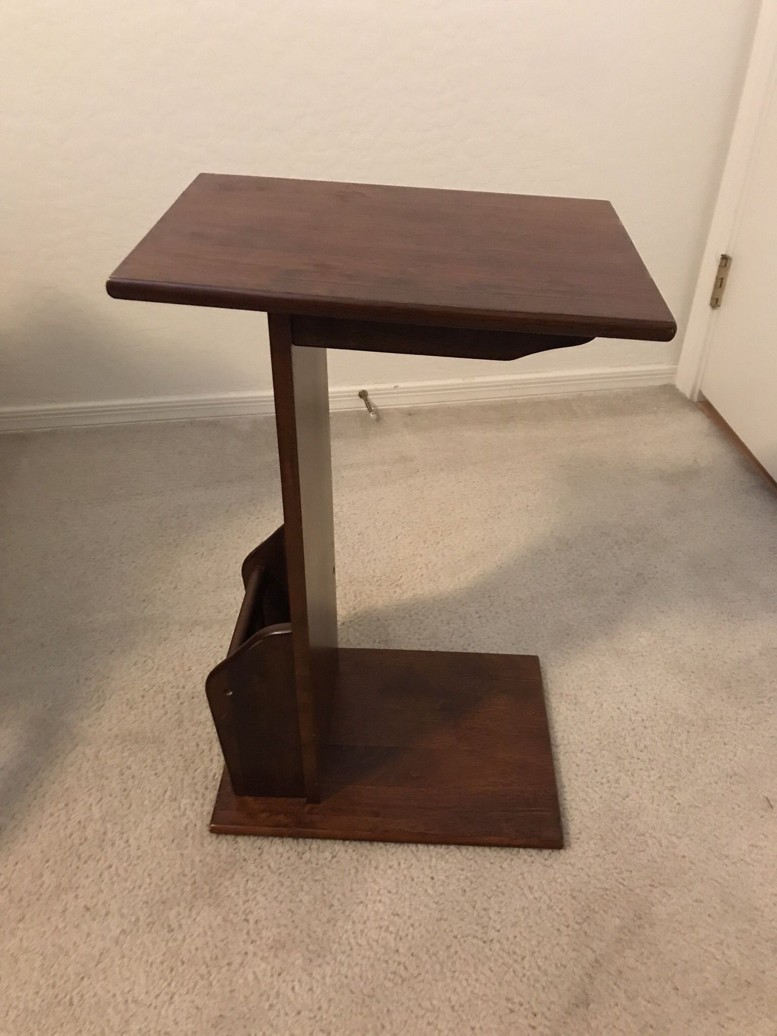 Smaller solid wood sofa table with magazine/book rack on back. Not all of these have that. Slides under sofa or chair for many uses. Very good condition. 24” x 11” x 15”.