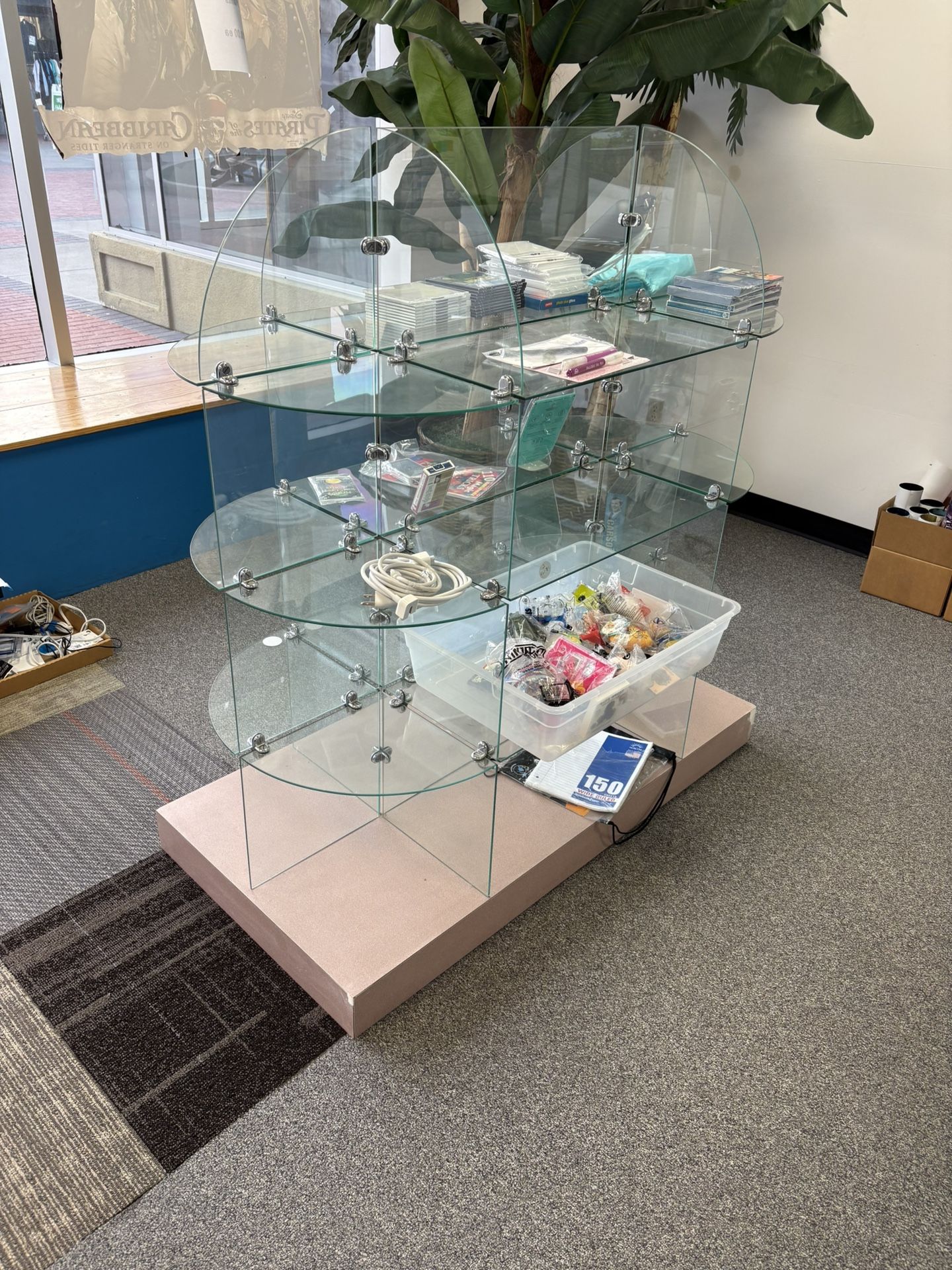 This is a glass display shelf usually used in retail locations. It is in great shape with a little “cart” scrapes in the base’s corners. Estimated Size 4 in high base 53-54 inches total height 25 wide 50 long