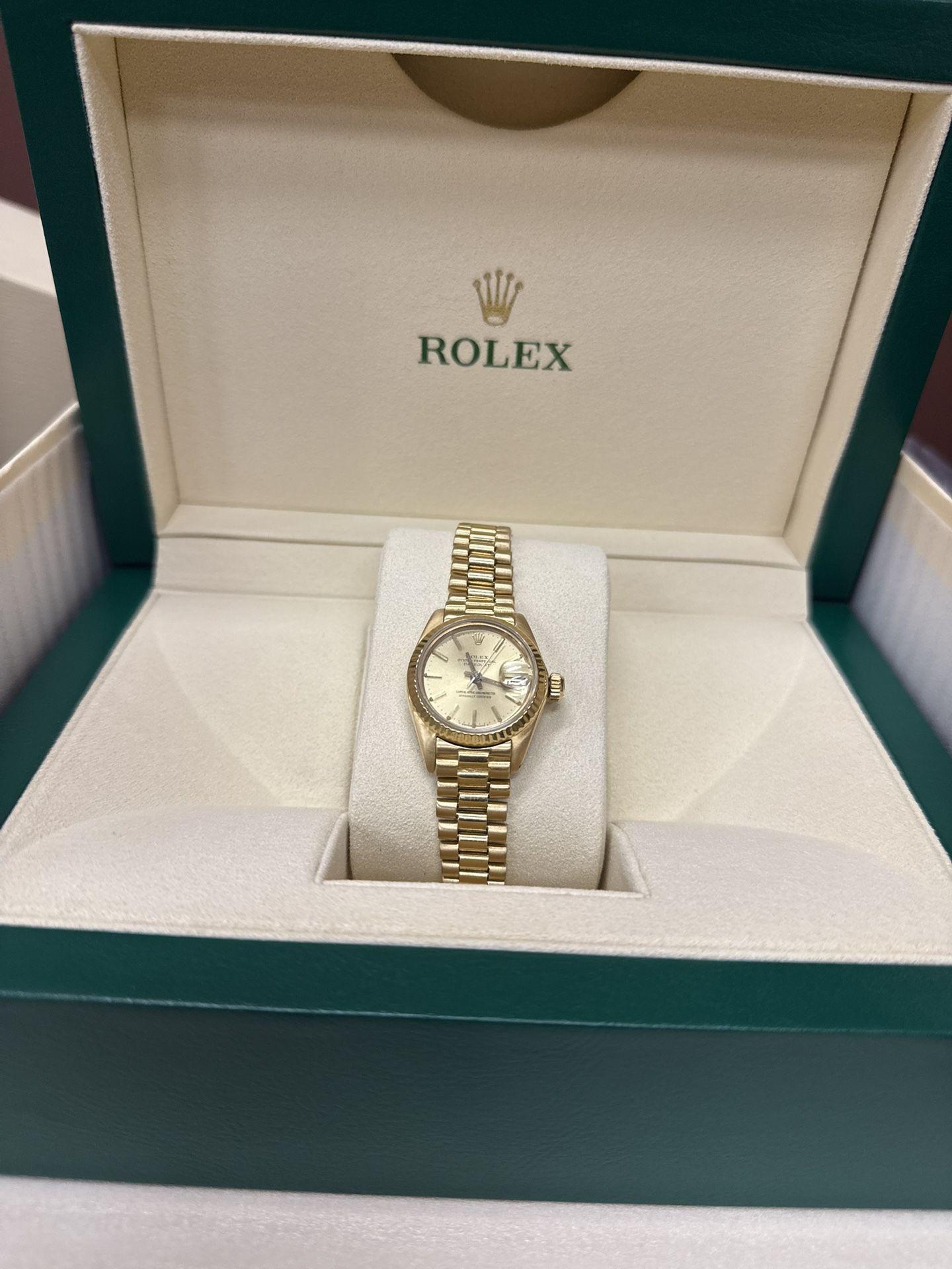 Rolex Datejust 26mm all factory. 18K Gold presidential. Comes with all the appraisal papers and original box. Comes with store warranty on the watch. LAYAWAY upto 6 months Zero interest. Financing available: Just put $75 down and take it home and pay the rest in 100 days on zero interest. Ask for Aly at Belmont Jewelers