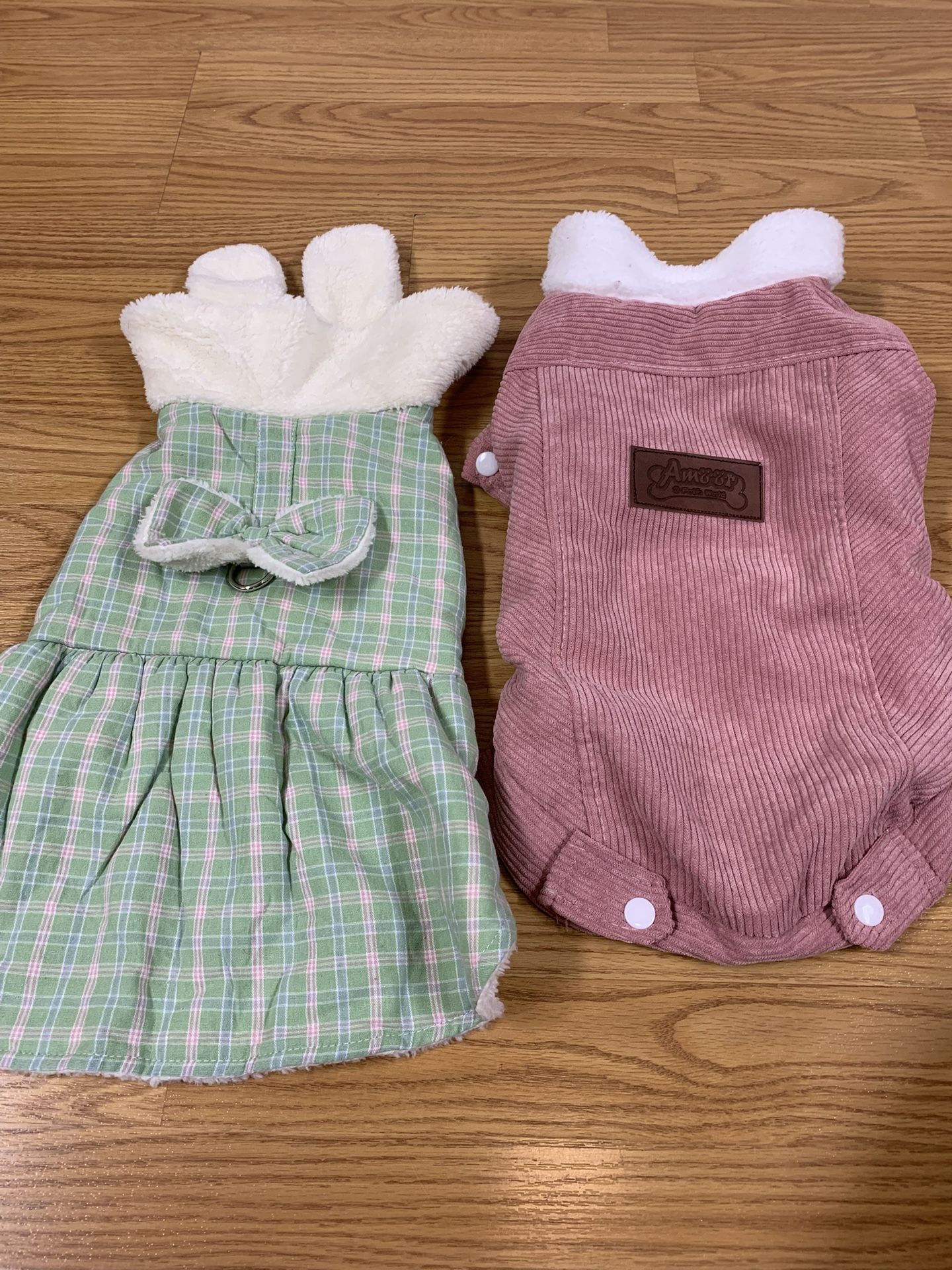 2 Medium Faux Sheep Skin Lined Dog Dress And Coat. The first one has ears like a bunny and a big bow on the front, matching the green and plaid material. This coat would be very warm for your little one, with the faux sheep skin lining throughout, the skirt is gathered which gives extra warmth, and the back is 4 snap closures on the full back but sleeveless. The second one is faux sheep skin lined as well, with pink corduroy material on front, sleeves are also lined like the entire coat. This is also a very warm coat. Brand new, never been used. From a smoke and pet free home. If this ad is still up, it is still available, I still have it
