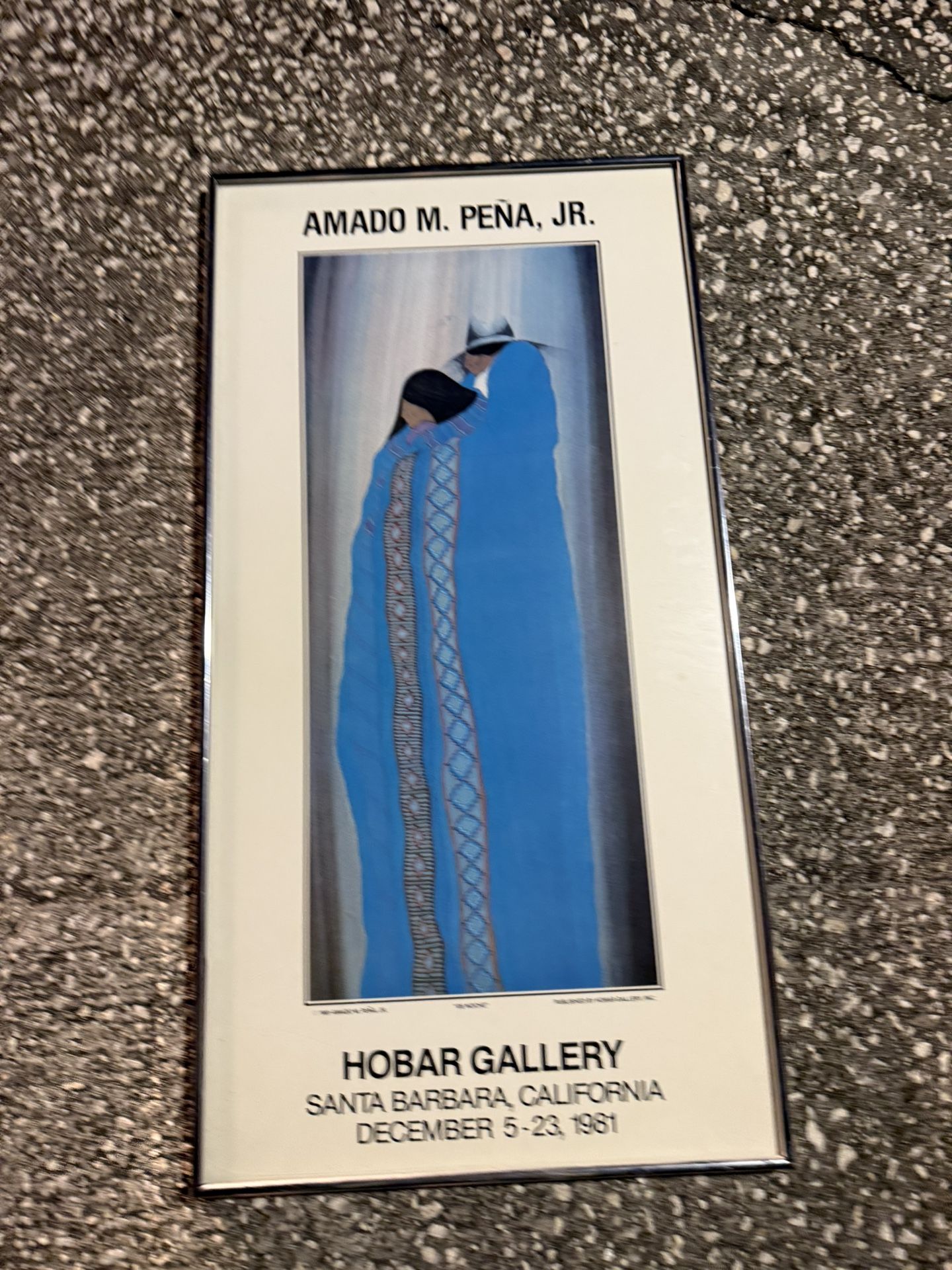 Vintage 1981 Amado M. Peña Jr. exhibition poster from the Hobar Gallery show in Santa Barbara, California (December 5–23, 1981). Classic Peña style with bold blue Navajo-inspired textile imagery. This is the official gallery poster, professionally framed, and ready to hang. Condition: Poster appears clean with no major visible flaws. Frame included (minor wear possible from normal handling). Details: • Artist: Amado M. Peña Jr. • Exhibition poster (1981) • Hobar Gallery, Santa Barbara • Dates: Dec. 5–23, 1981 • Framed • Vintage collectible Southwestern art