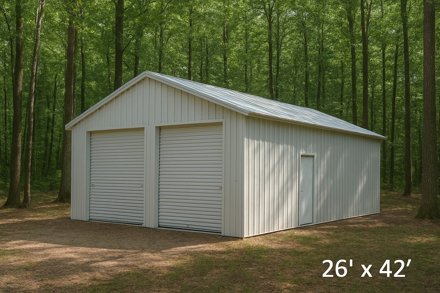 26' wide by 42' Long complete shop kit colored in Beige with Dark brown trim (similar as reference photo) Comes with everything needed to assemble shop shown in picture on the box (does not come with roll up doors) does come with a side man door. Door openings measure 8.5'x8.5' and total height of the building is 14' The building has 16 gauge tube steel for the frame and 27 gauge siding. Everything is pre cut and drilled ready to literally bolt together. No cutting or fabricating needed. Easy assembly Asking $6000