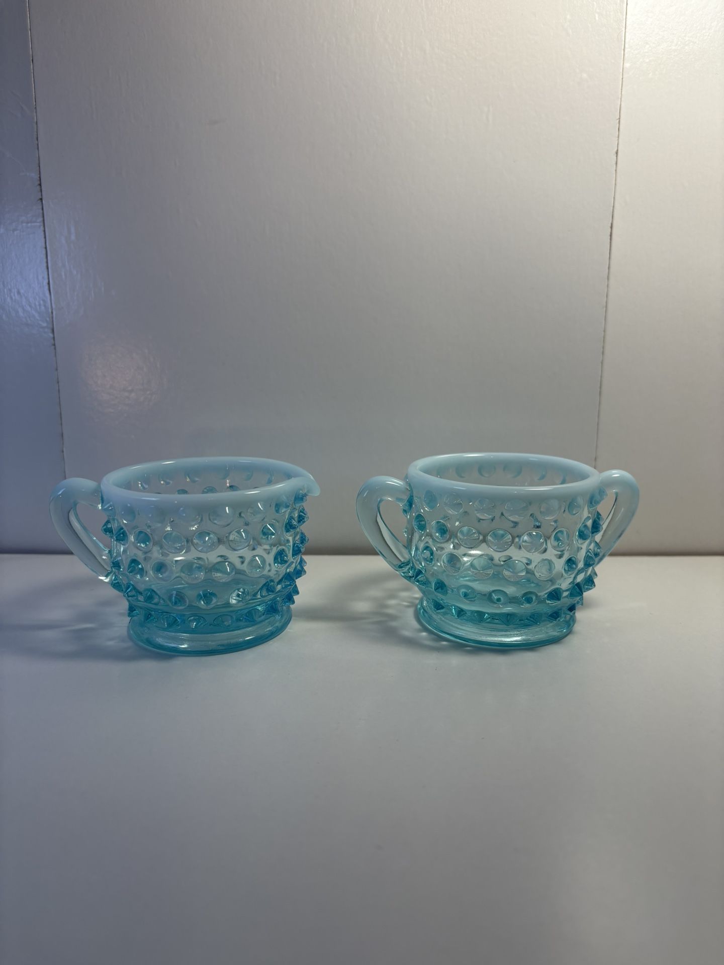 Vintage Fenton Blue Opalescent Hobnail Small Creamer and Sugar Set, One has a small blemish inside the glass.