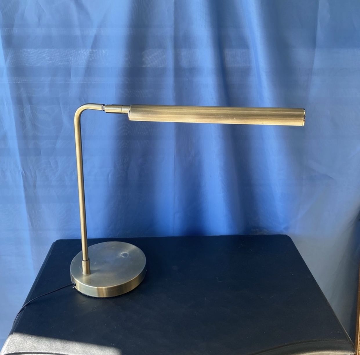 Pick up 115th ave and bell rd Elegant brass desk lamp with a modern design. Perfect for any workspace. Without bending the light up at 16 inches tall, however, it does bend straight up if you want. 16.5” w This is a beautiful lamp. It gives off great LED lighting. Perfect for desk or bedside. Purchased at Office store for $79 was also at Kohl’s for $79.