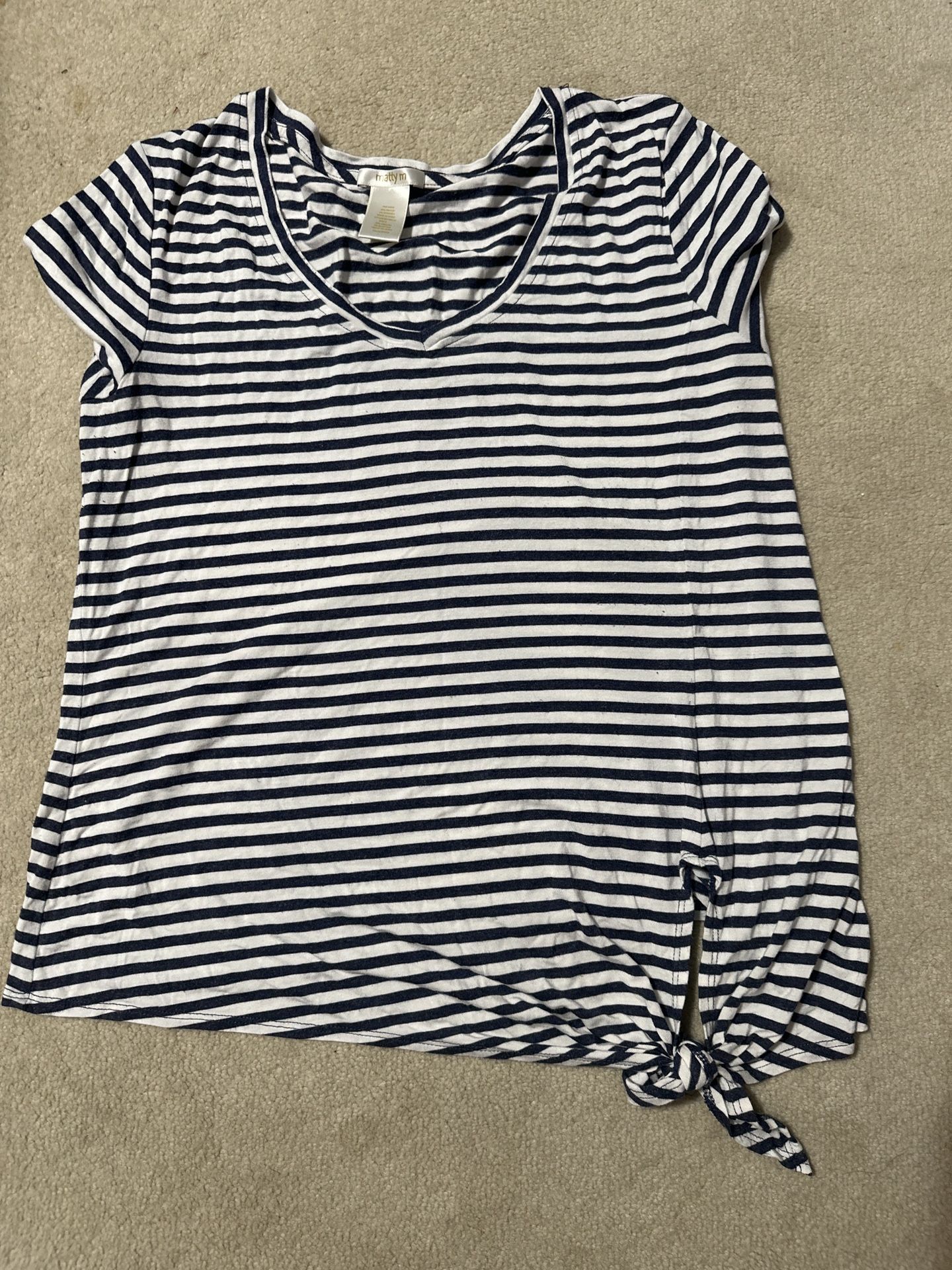 Navy and white striped V-neck T-shirt with tie detail. Women’s Small