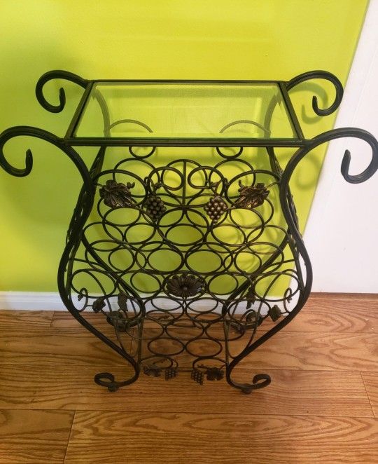 Wrought Iron wine rack with glass top. Sturdy