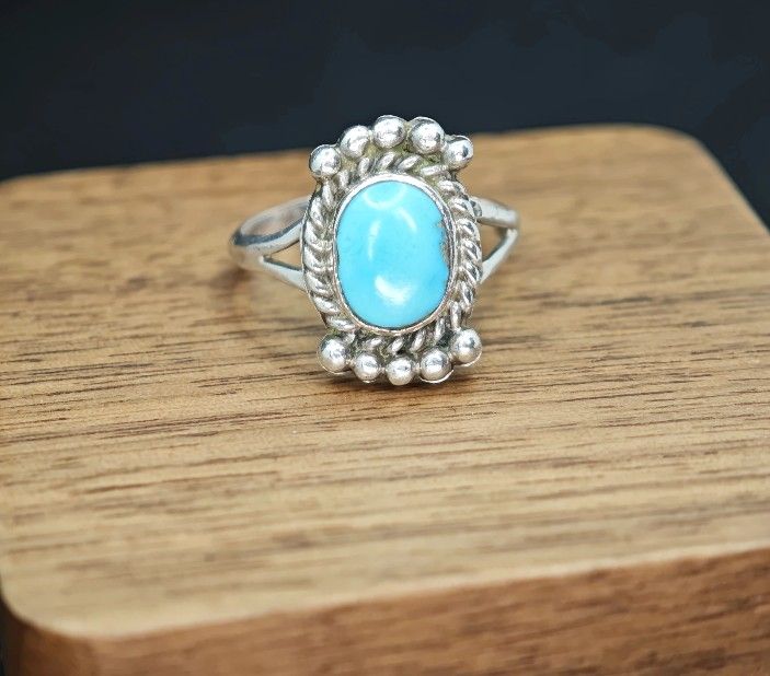 Vintage Navajo sterling silver Sundance style ring with large turquoise stone . Stamped "STERLING". EUC .