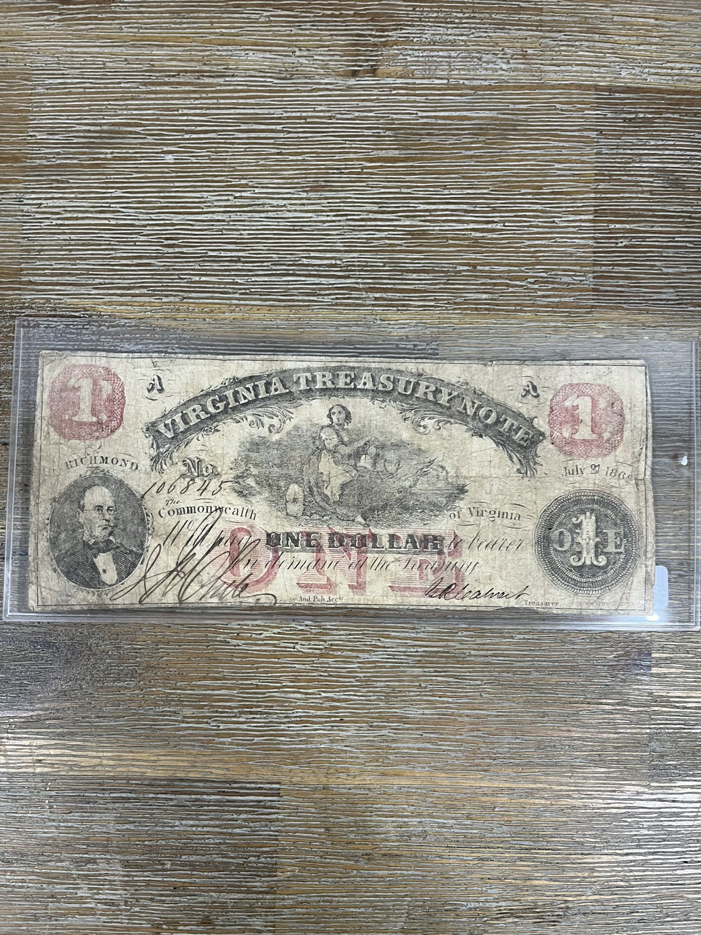 $1 Dollar Signed Virginia Treasury Note July 21th 1862