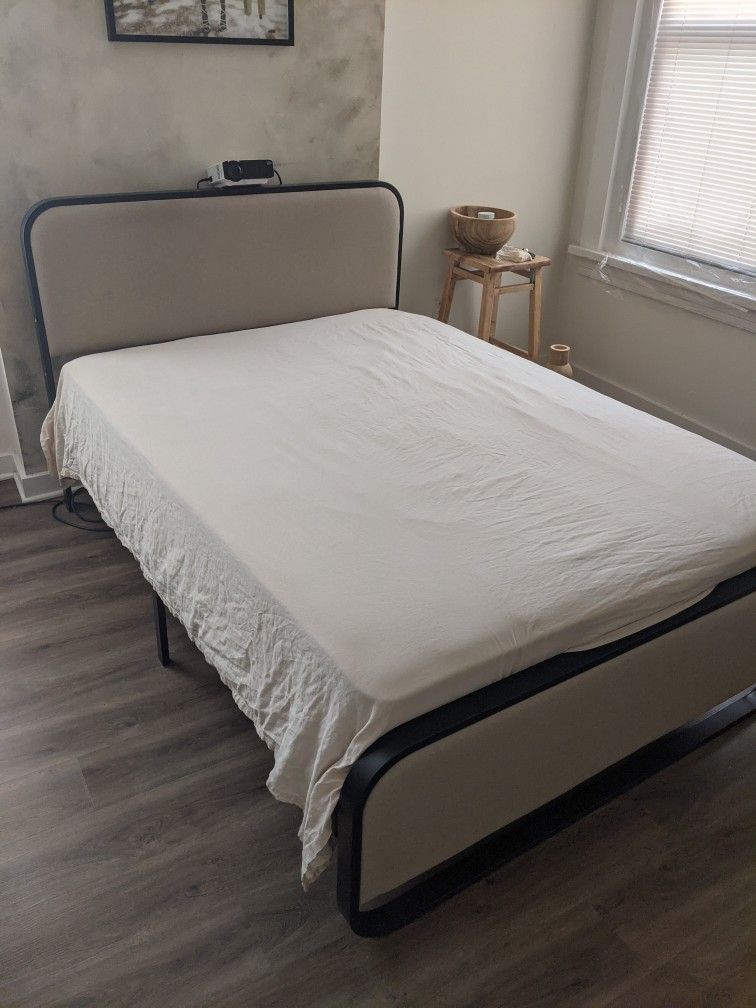 This is a full size bed frame in great condition. Definitely great for your new place, and great for a first place. We have had it for about 3 years, it doesnt squeak or make sounds. Aesthetically a great frame.