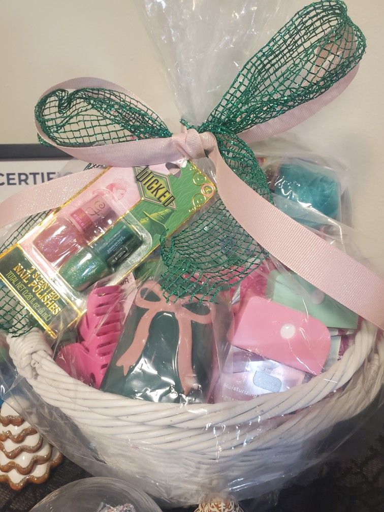 This basket is filled to the brim with pink & green wicked licensed products such as eye shadows, lip gloss, lip balm, bath bombs, masks and more! Then you add in hair clips, hand sanitizers, ponytail holders, candles and so much more! This basket has it all and it's the last one I have!!
